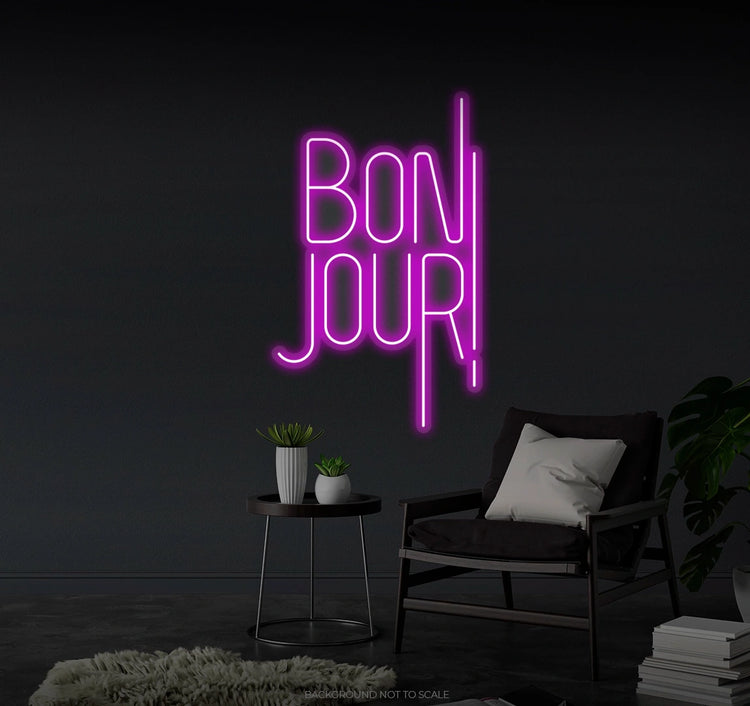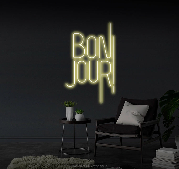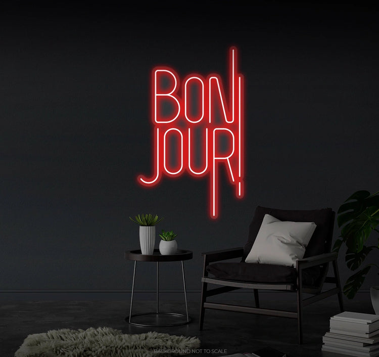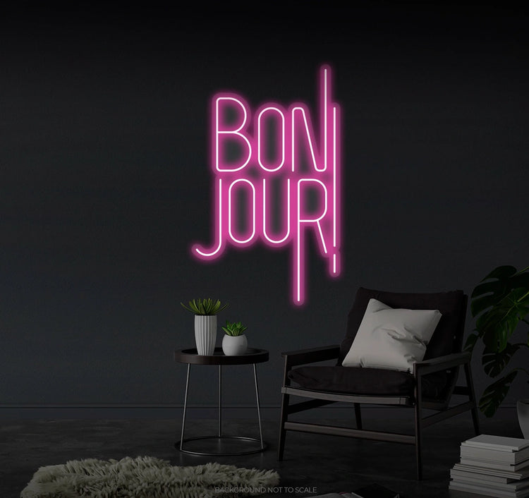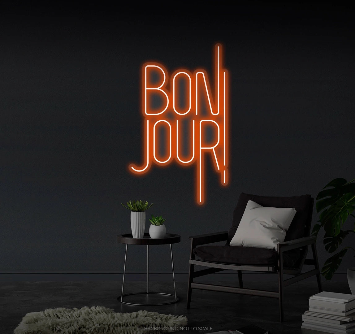 Warm Radiance: Illuminate your space with the inviting glow of "Bon Jour." This neon sign radiates warmth and friendliness, creating an atmosphere that welcomes guests and lifts spirits.