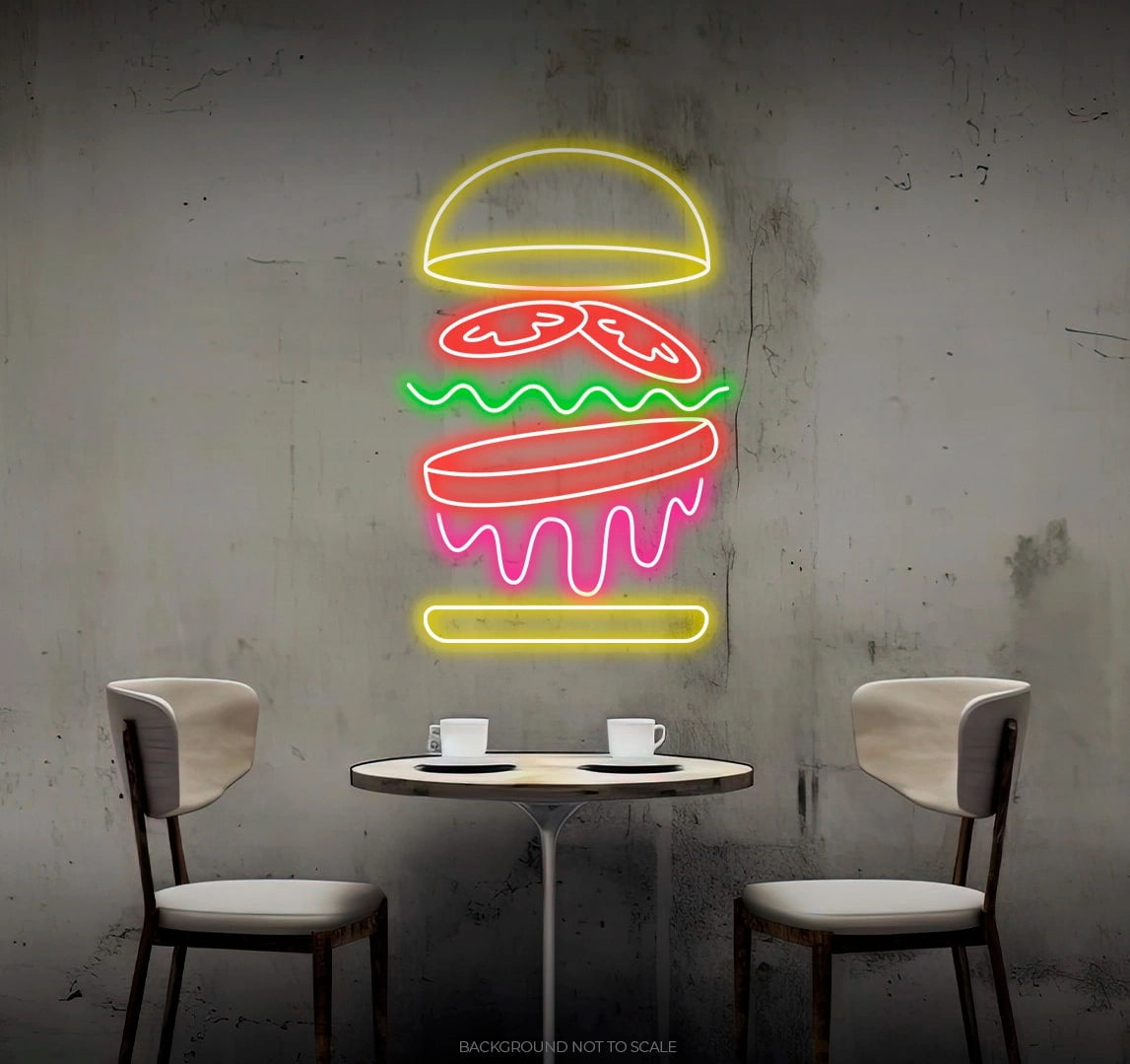 Customizable Culinary Hues: Personalize your neon sign with an array of culinary-inspired colors and sizes. Tailor it to complement your kitchen decor or create a combination that resonates with the delicious and artful world of gourmet burgers.