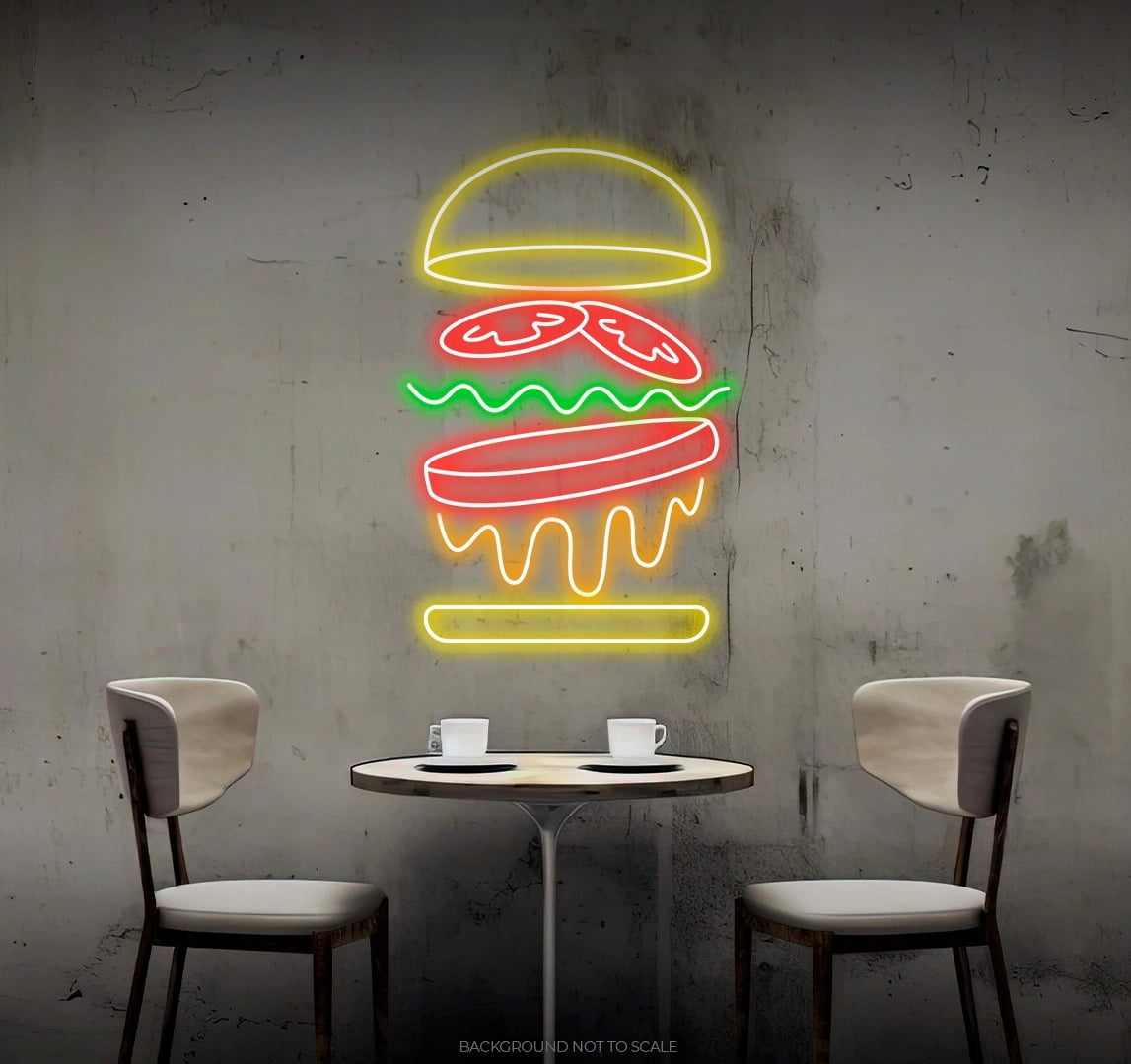 Tasty Energy Efficiency: Unlike traditional sources of culinary inspiration, our LED neon sign boasts energy efficiency, casting a radiant glow that symbolizes the delicious creativity of a burger tower without draining your culinary reserves.
