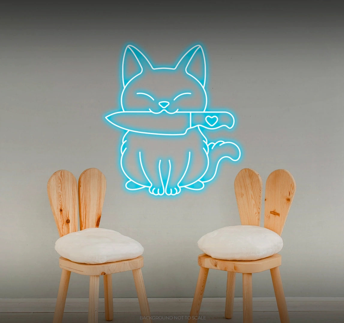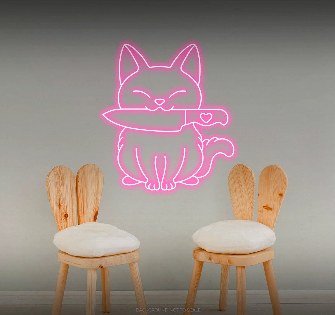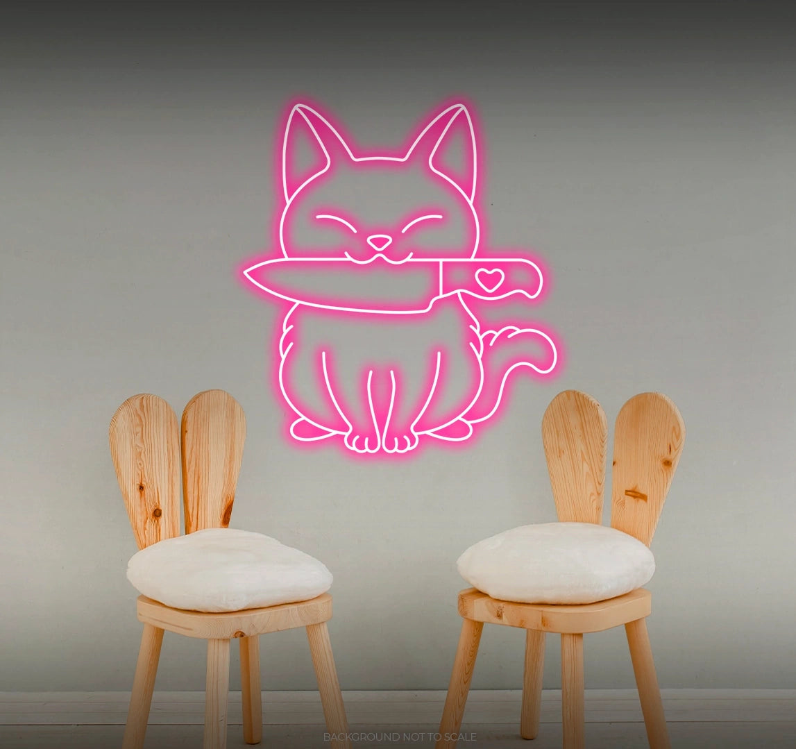 Whimsical Illumination: - Watch as our LED neon sign lights up your space with a whimsical and enchanting glow, featuring the charming combination of a cat and a stylized knife in a playful arrangement 🐾🔪.
