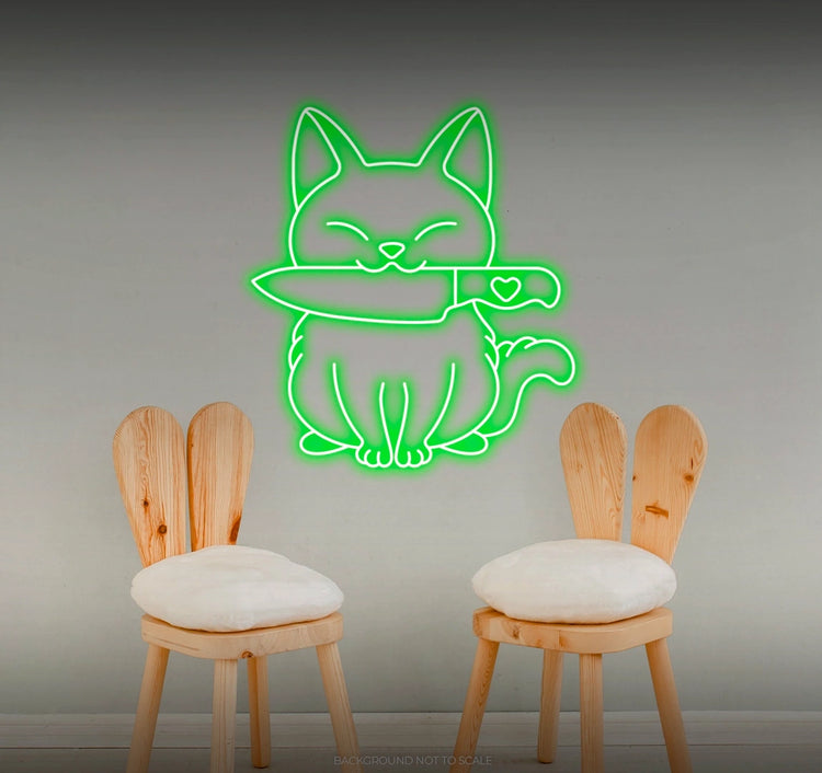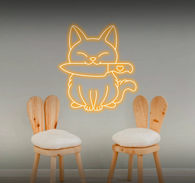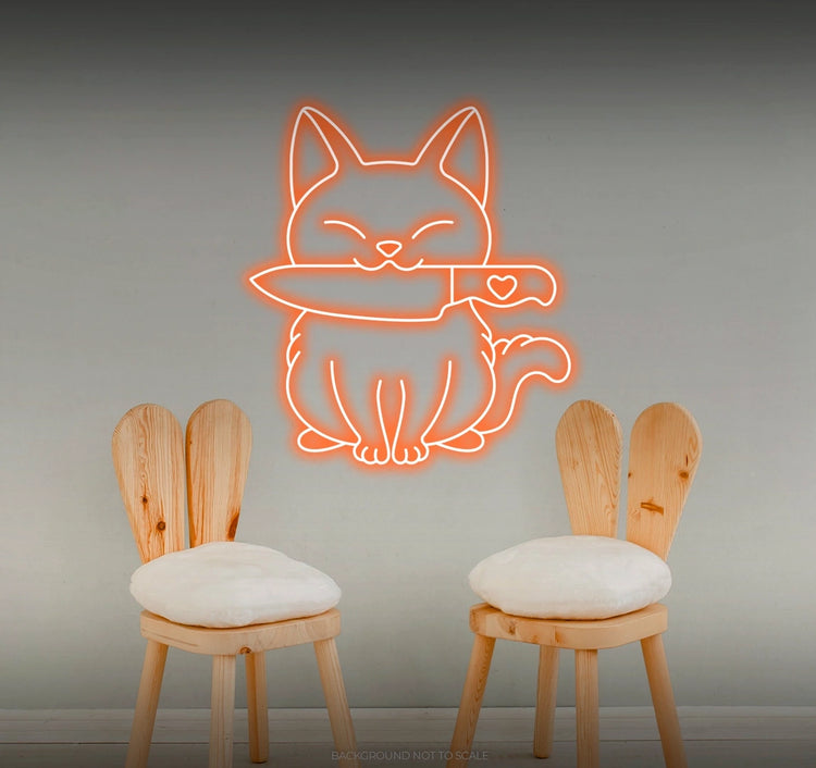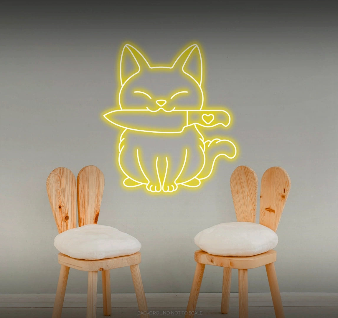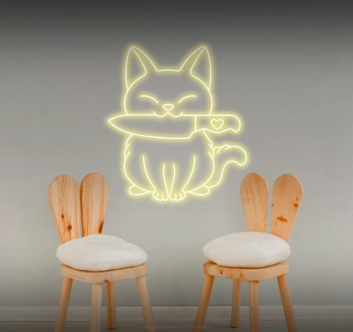 Whimsical Illumination: - Watch as our LED neon sign lights up your space with a whimsical and enchanting glow, featuring the charming combination of a cat and a stylized knife in a playful arrangement 🐾🔪.