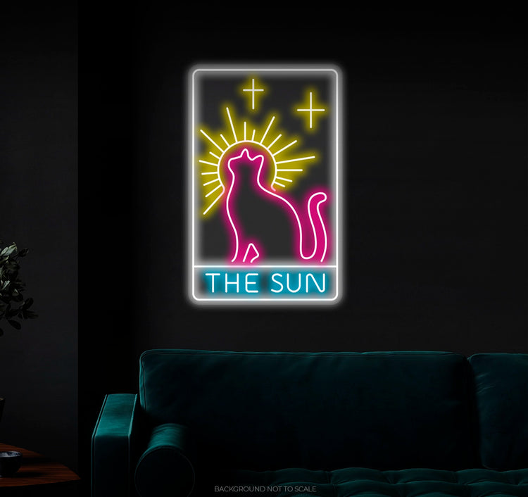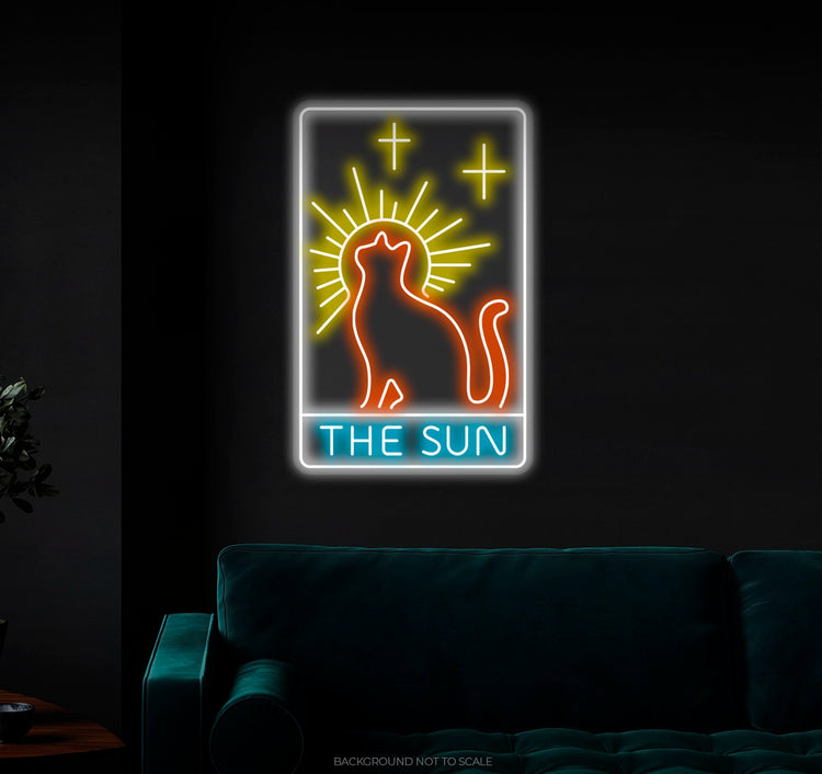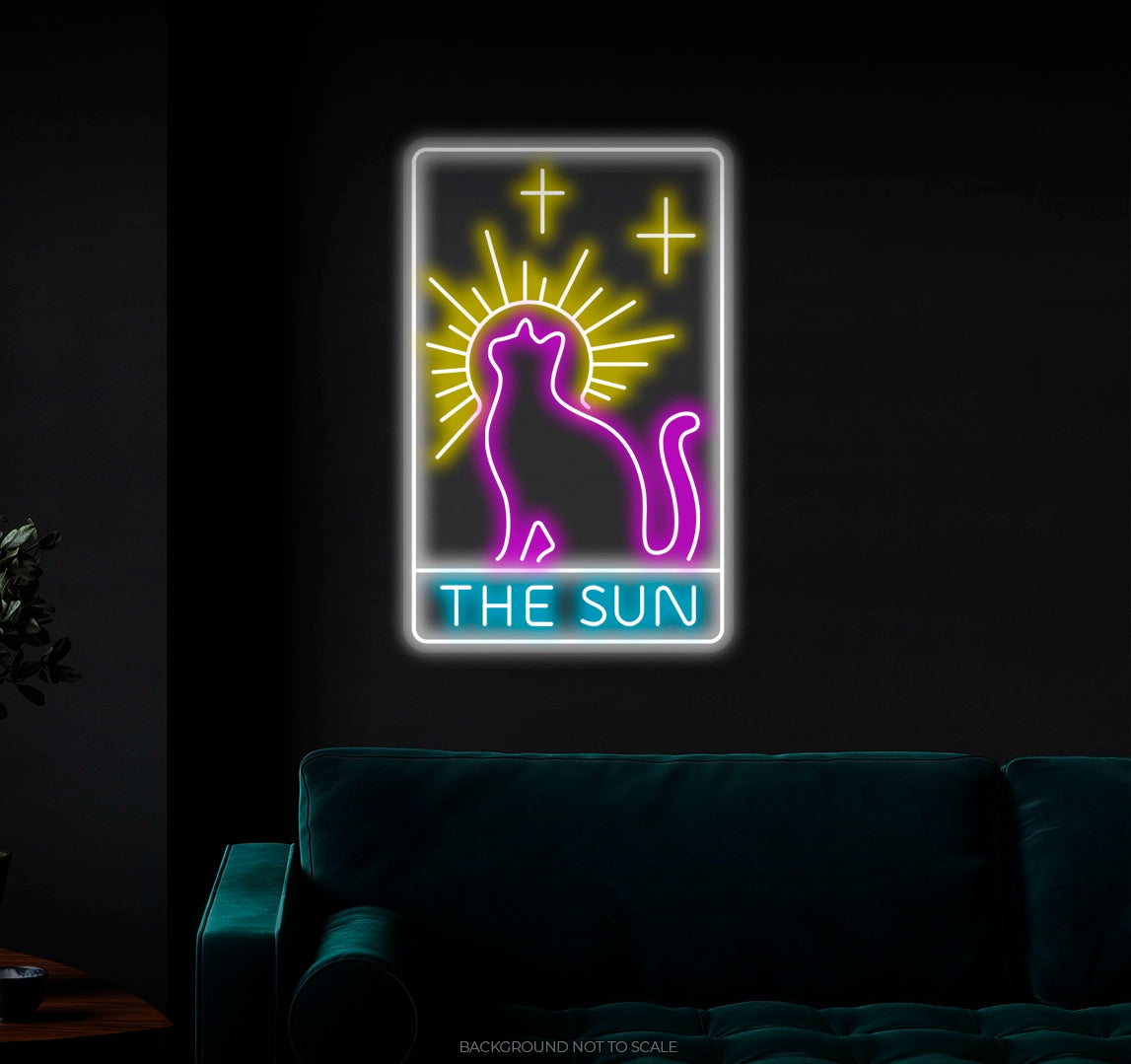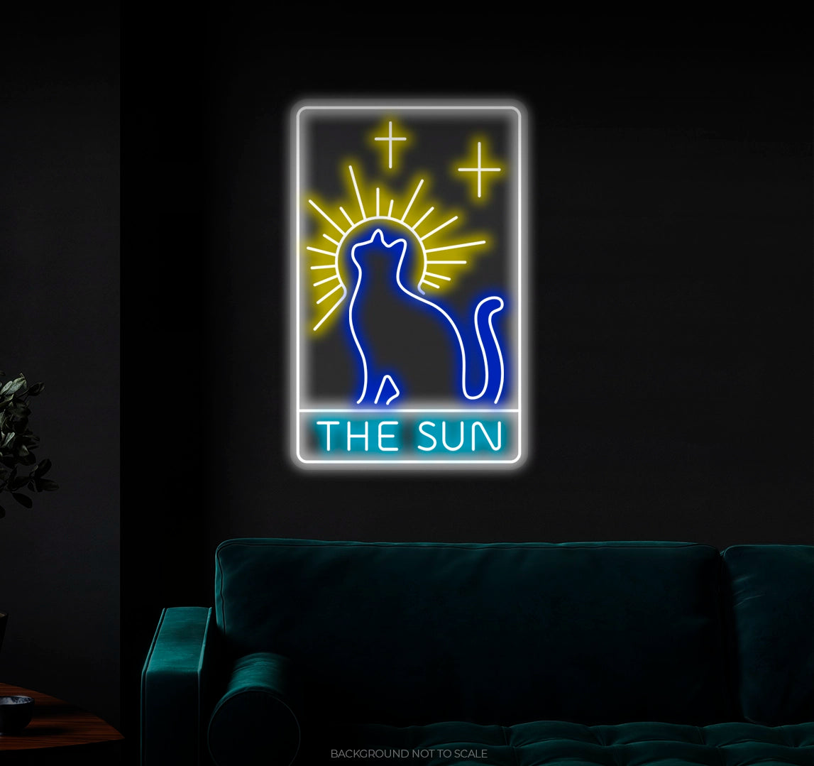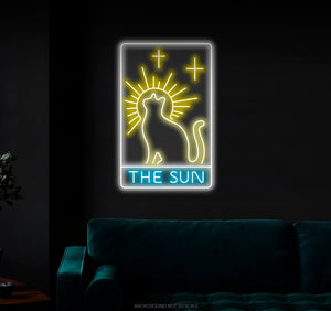 Whimsical Glow: Illuminate your space with the cheerful radiance of our "Cat The Sun Card" LED Neon. This design features a cute cat lounging under a bright sun, creating a warm and inviting atmosphere that will brighten your day.