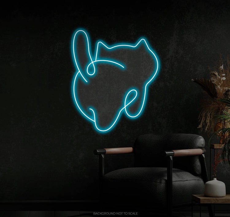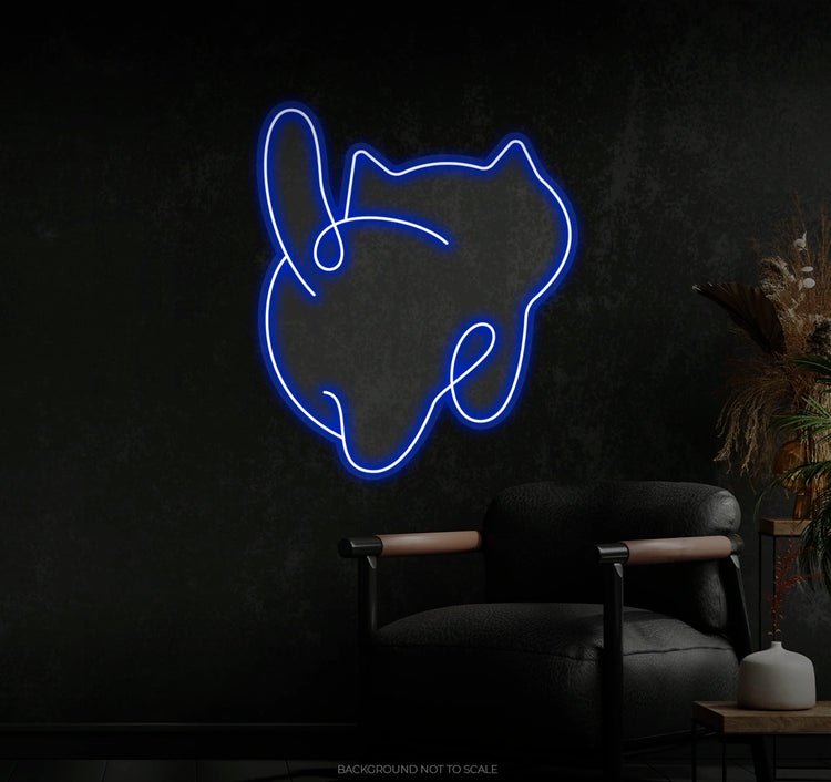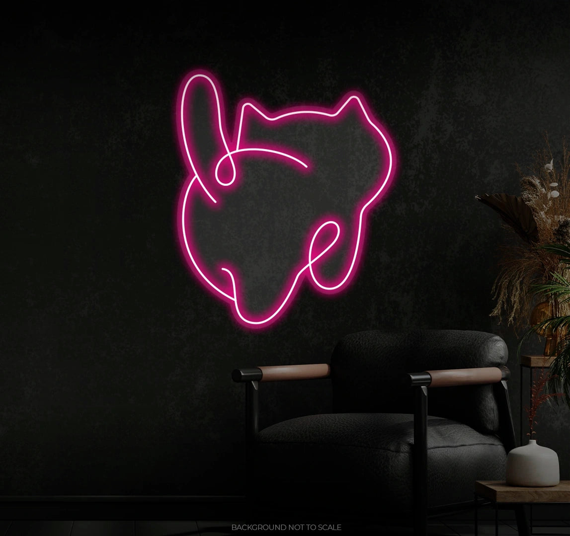 Adorable Cat Design: The neon outlines the rear view of a chubby cat, complete with a wiggly tail and soft curves that capture its charm and cuteness.