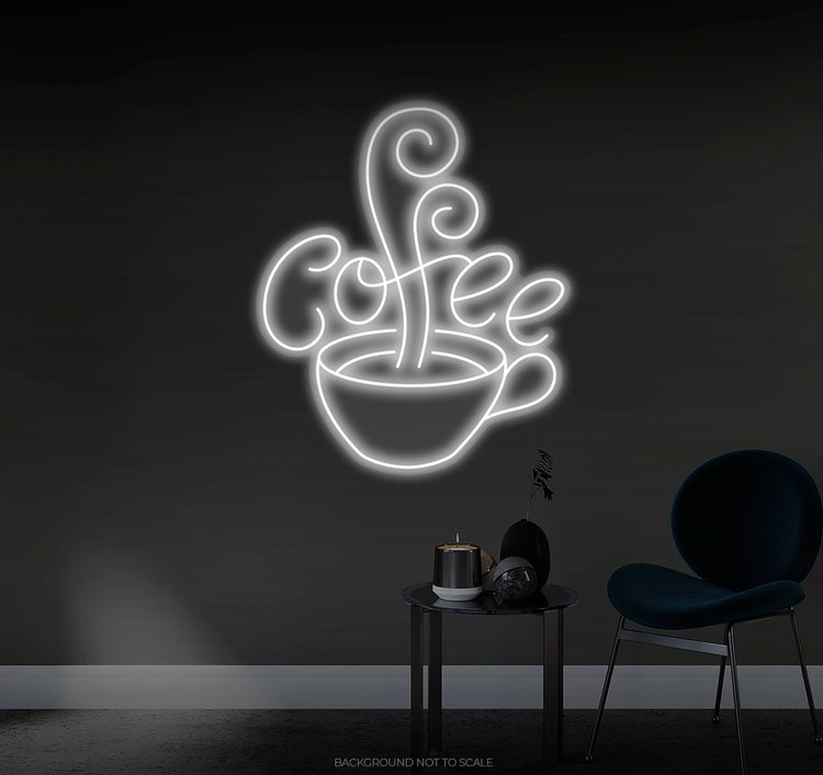 Coffee & Smoke Concept: The neon sign creatively represents the steam from a coffee cup transforming into the word "Coffee" written in an artistic, swirling smoke-like script. This beautiful, fluid design combines the essence of coffee and the elegance of neon art.