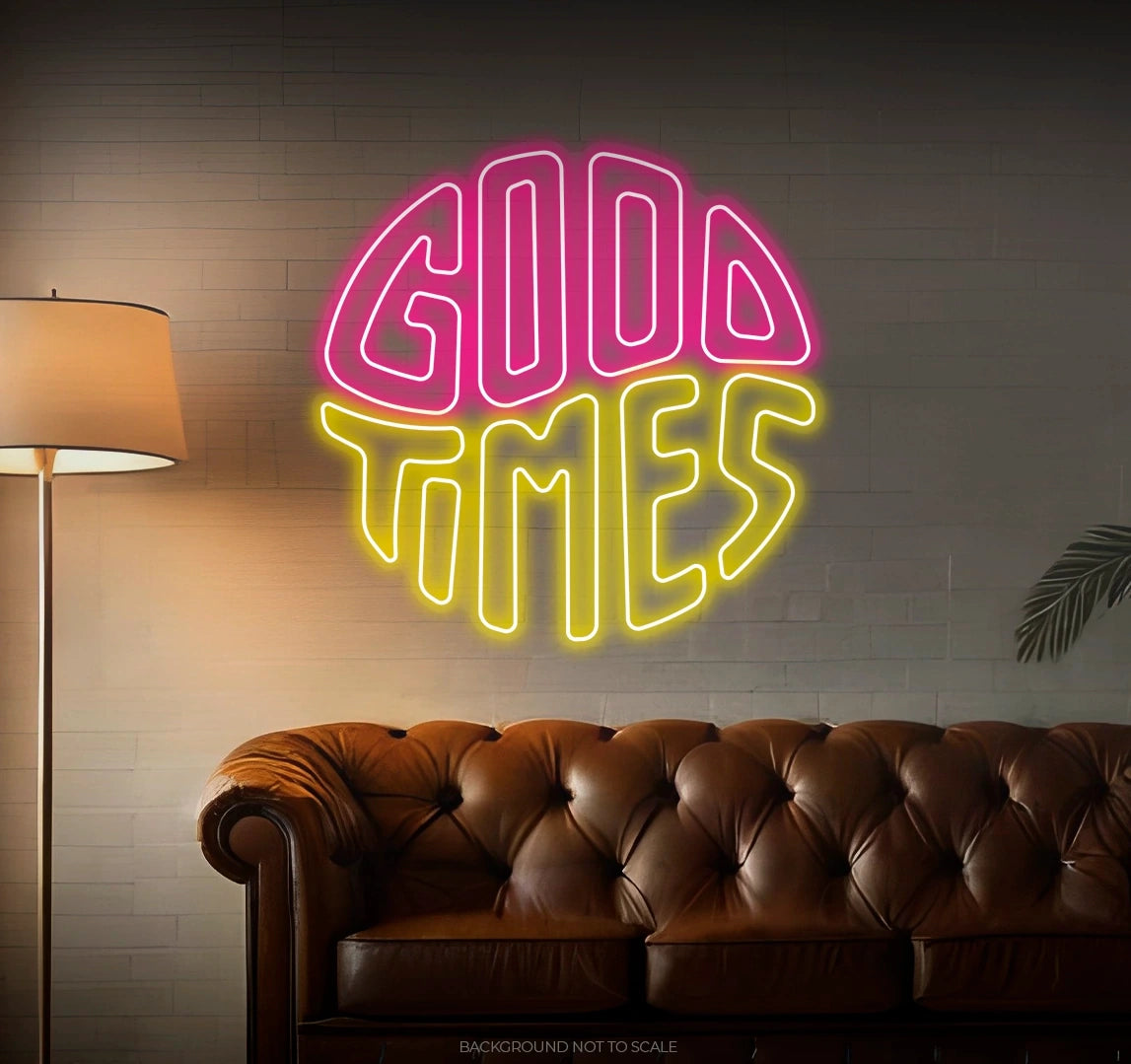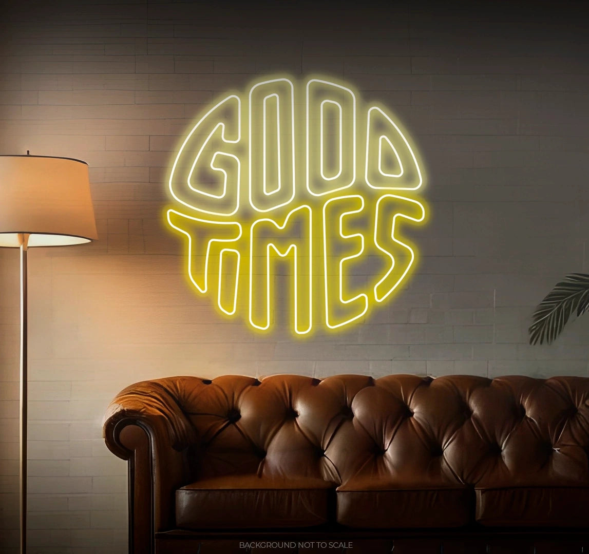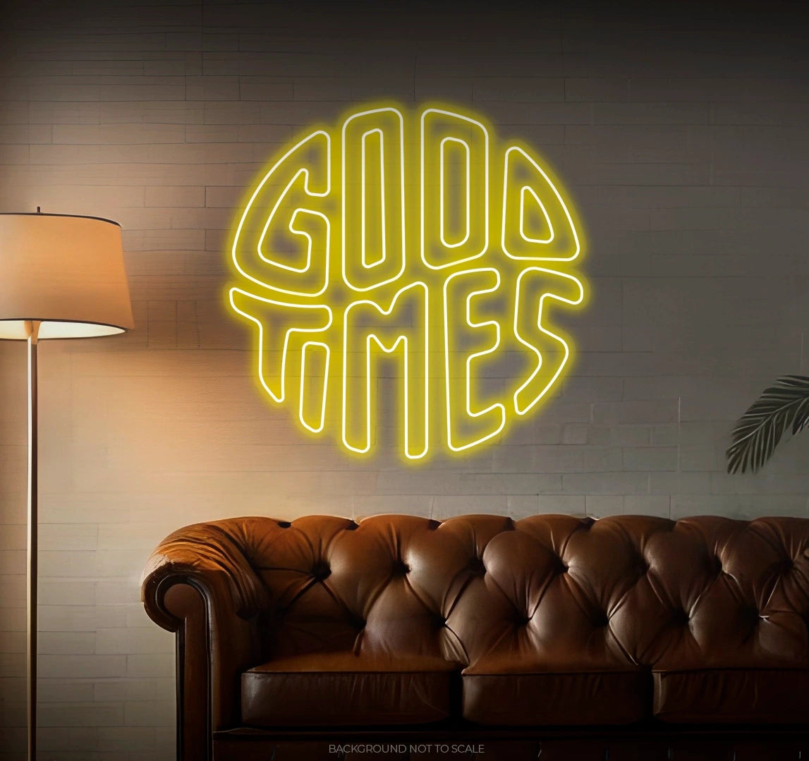 - Immerse your space in the warm and inviting glow of our LED neon sign, featuring the cheerful phrase "Good Times" within a captivating circle shape.