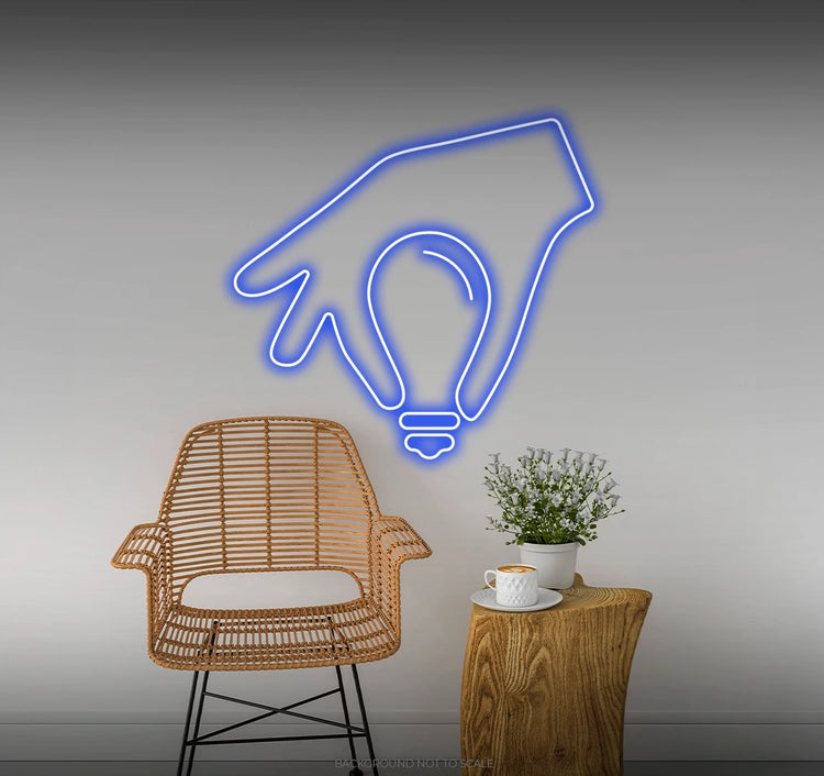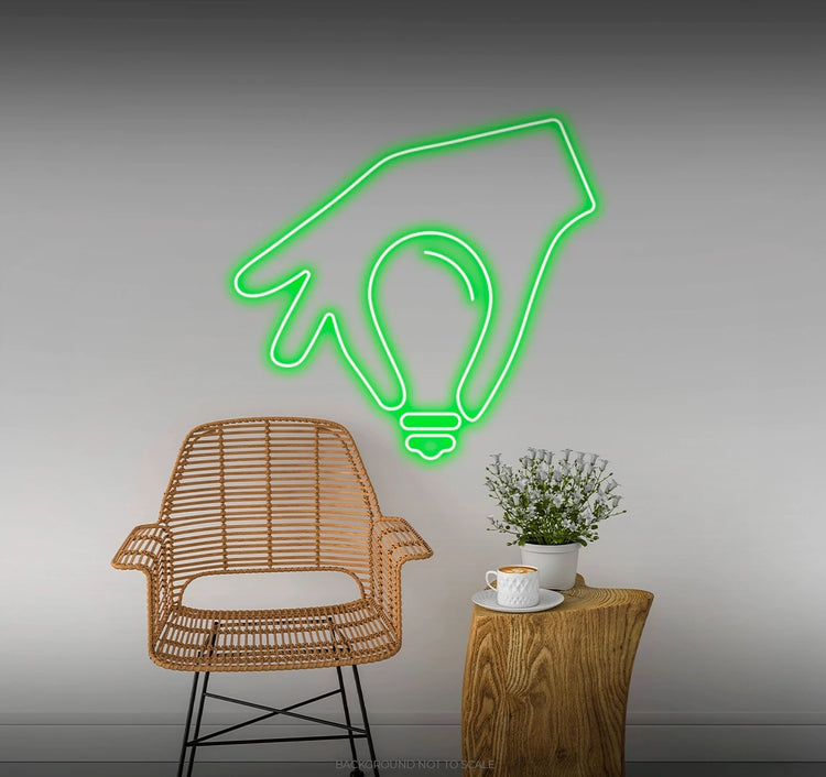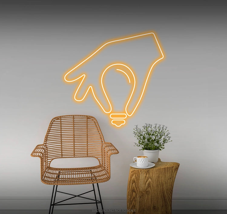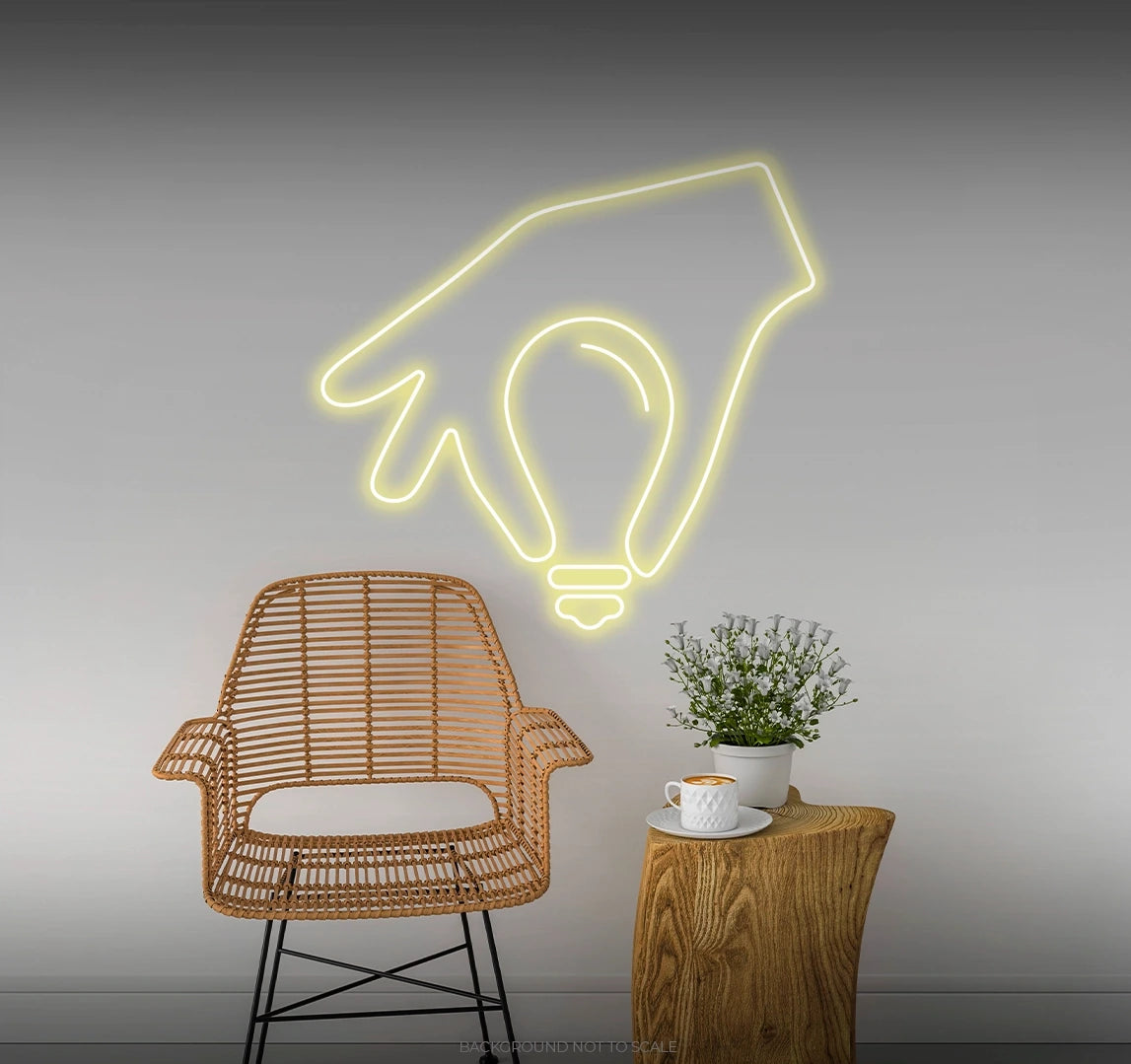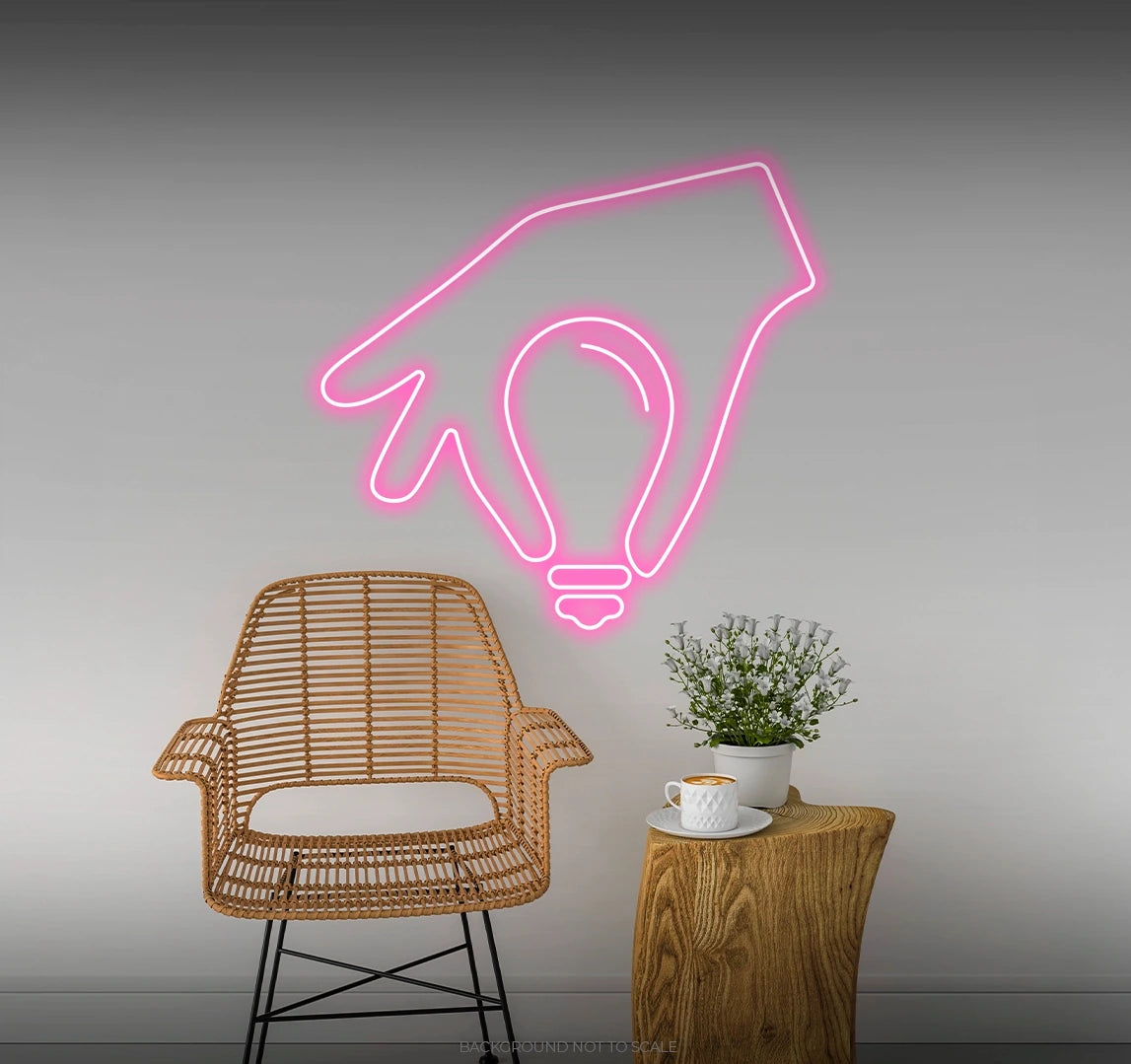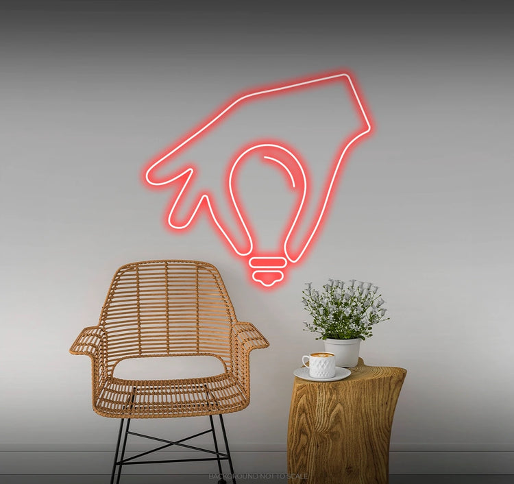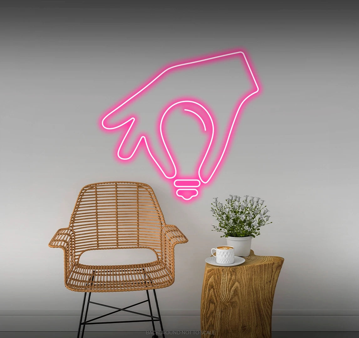 - Immerse your space in the inventive glow of our LED neon sign, featuring a captivating design of a hand holding a light bulb.