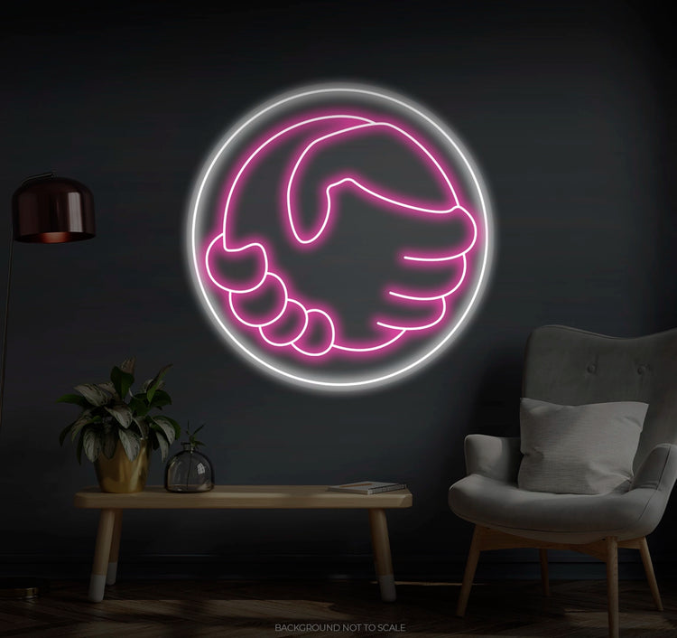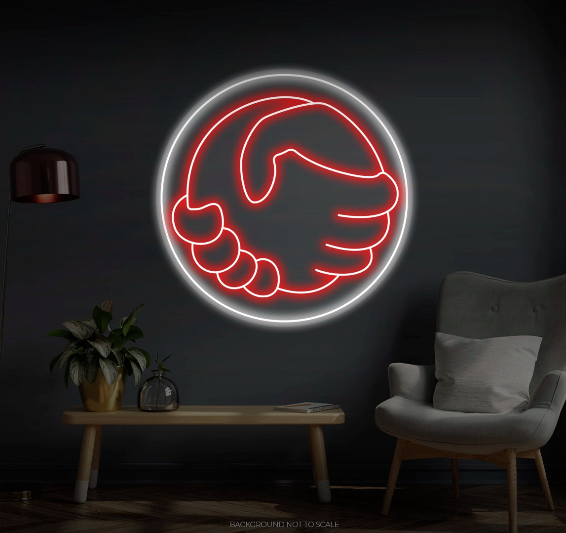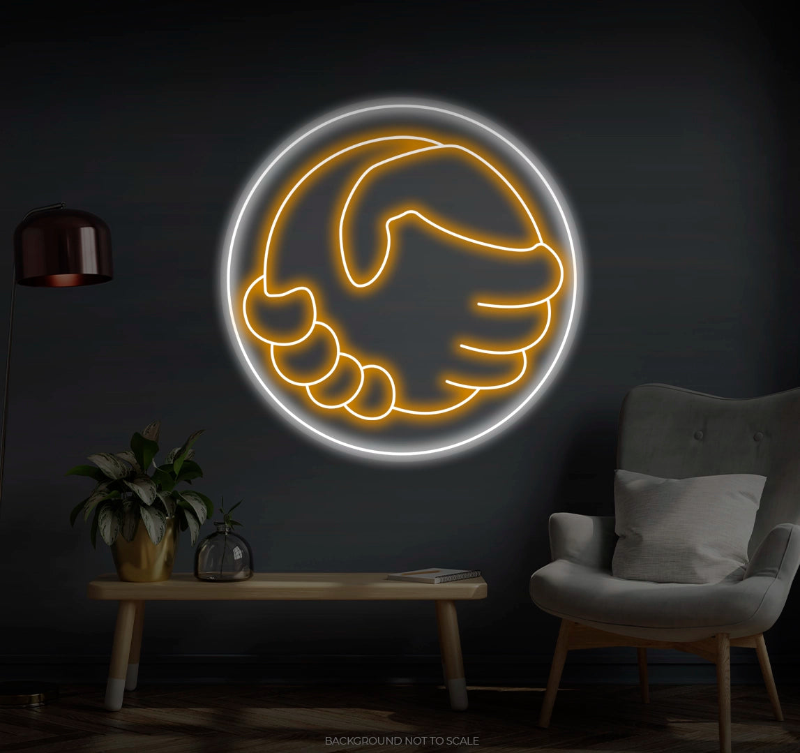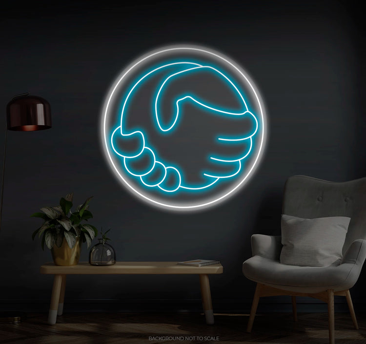Illuminate your space with the "Handshake Circle" LED Neon, a design that symbolizes partnership, collaboration, and mutual respect. This elegant neon sign is perfect for businesses, offices, or any setting where relationships and teamwork are valued. Its glowing light serves as a reminder of the power of working together.