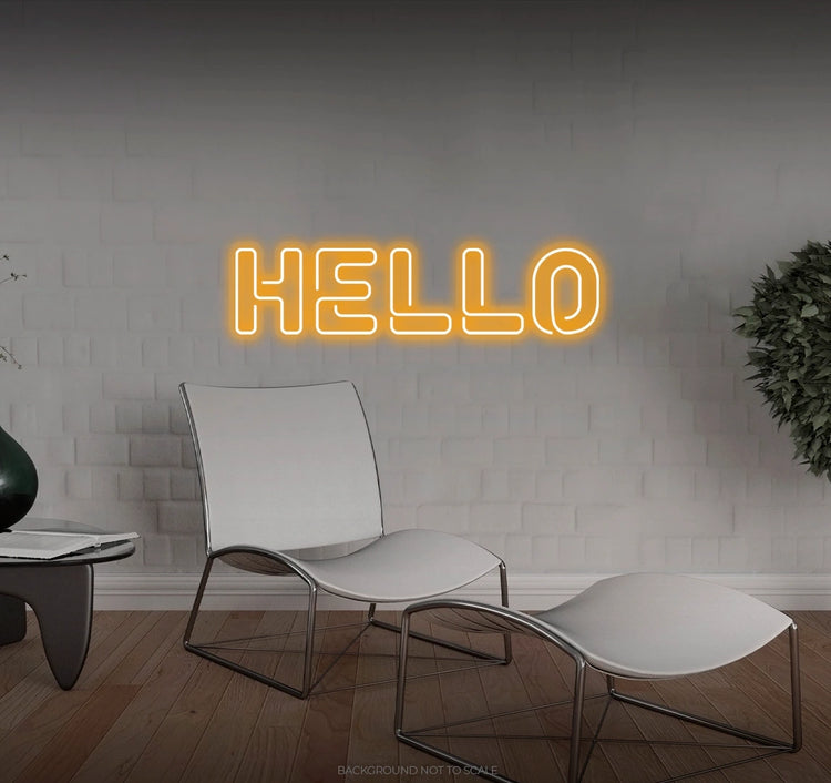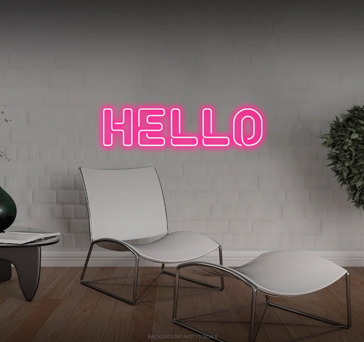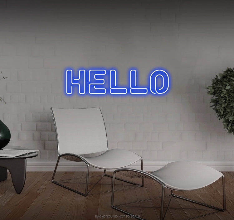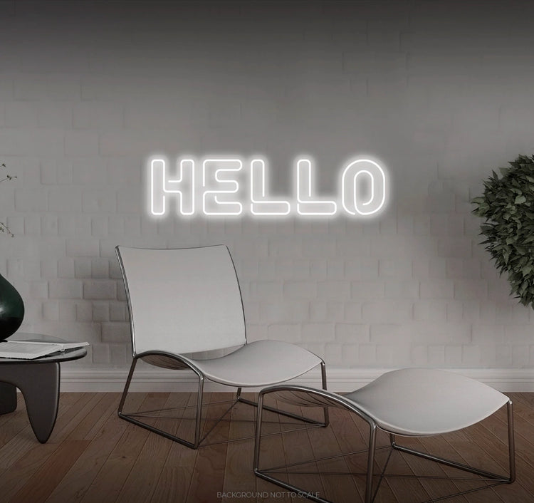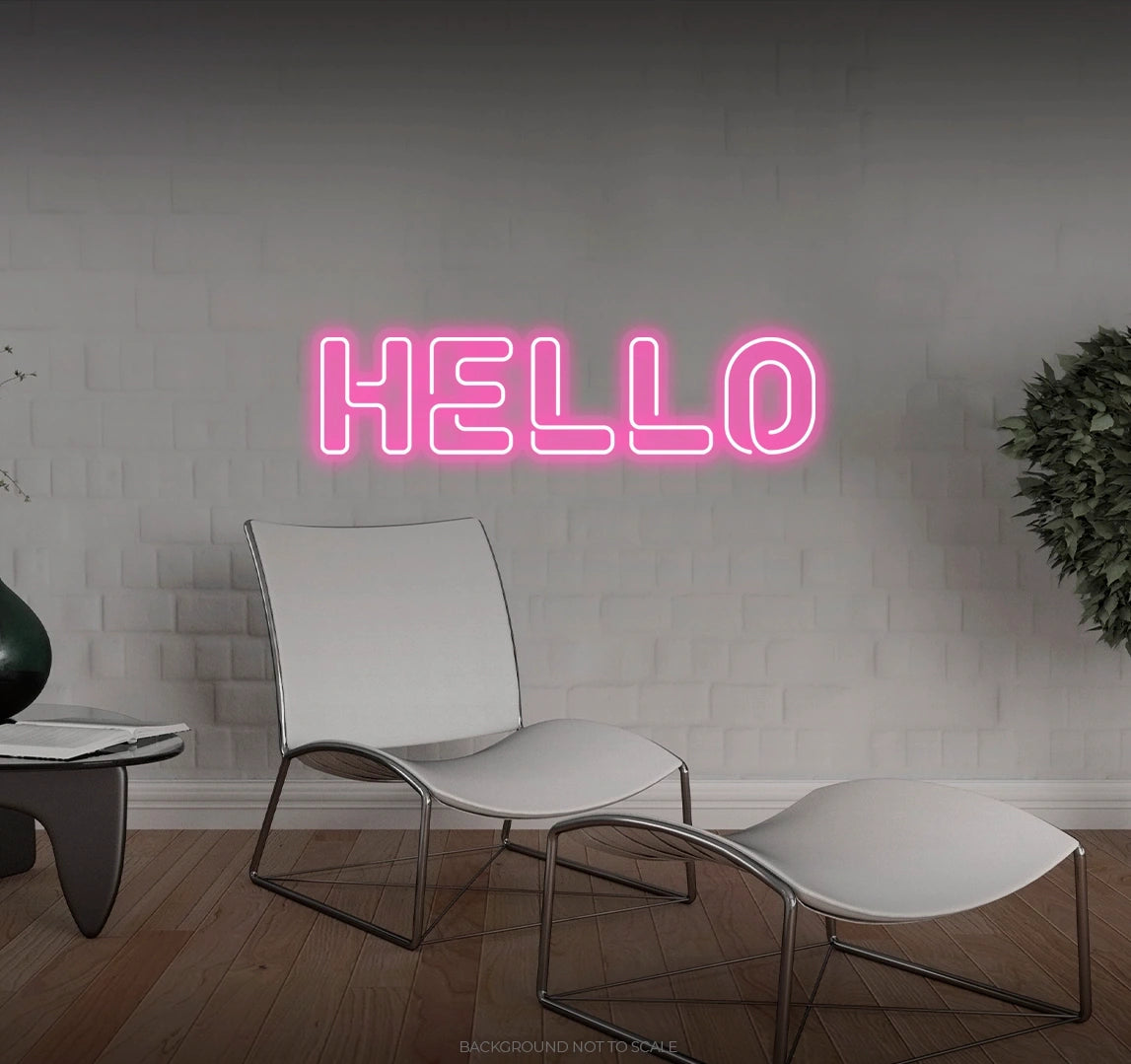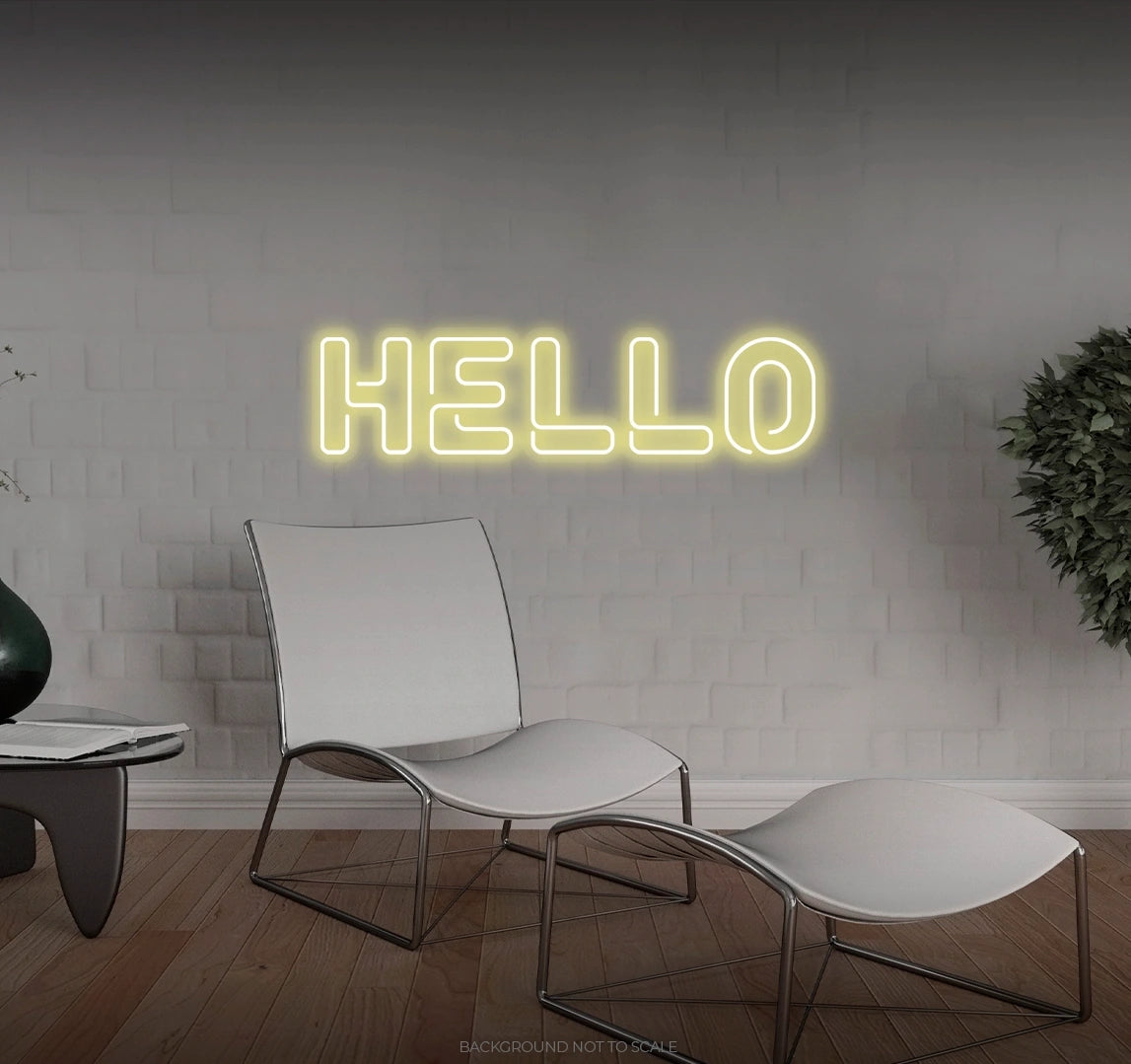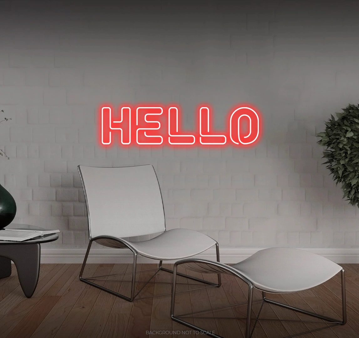 - Immerse your space in the sophisticated glow of our LED neon sign, featuring sleek and stylish lines that spell out the greeting "Hello."