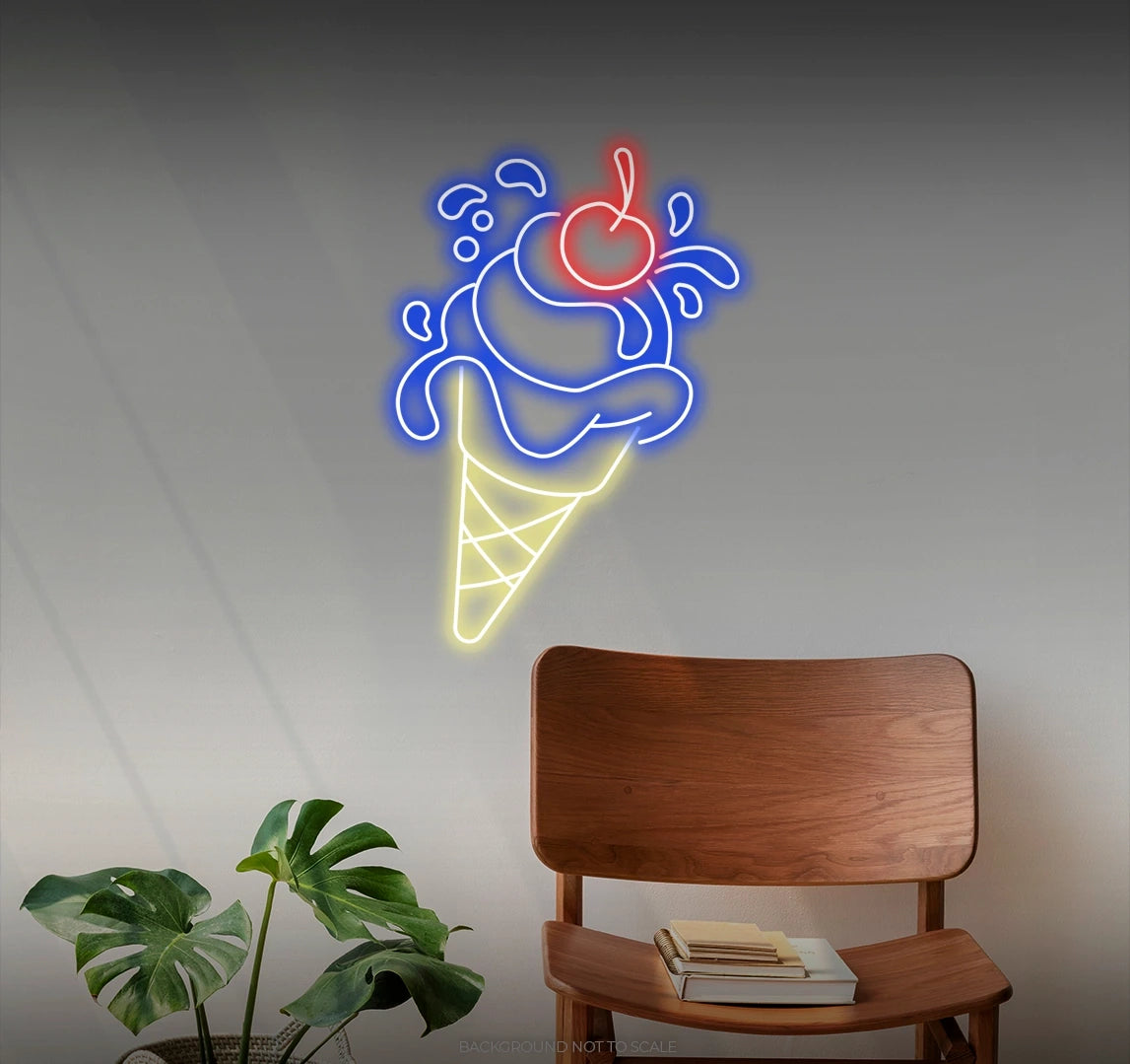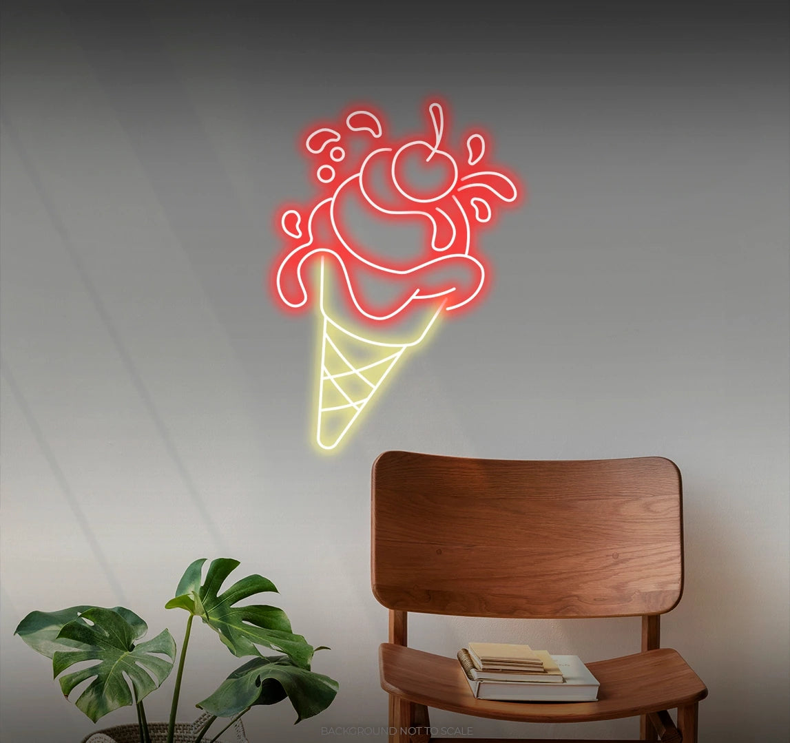 - Immerse your space in the delightful glow of our LED neon sign, featuring the mouthwatering design of an ice cream cone topped with a cherry.