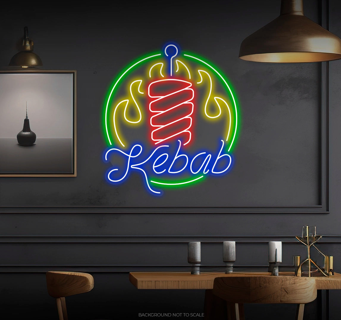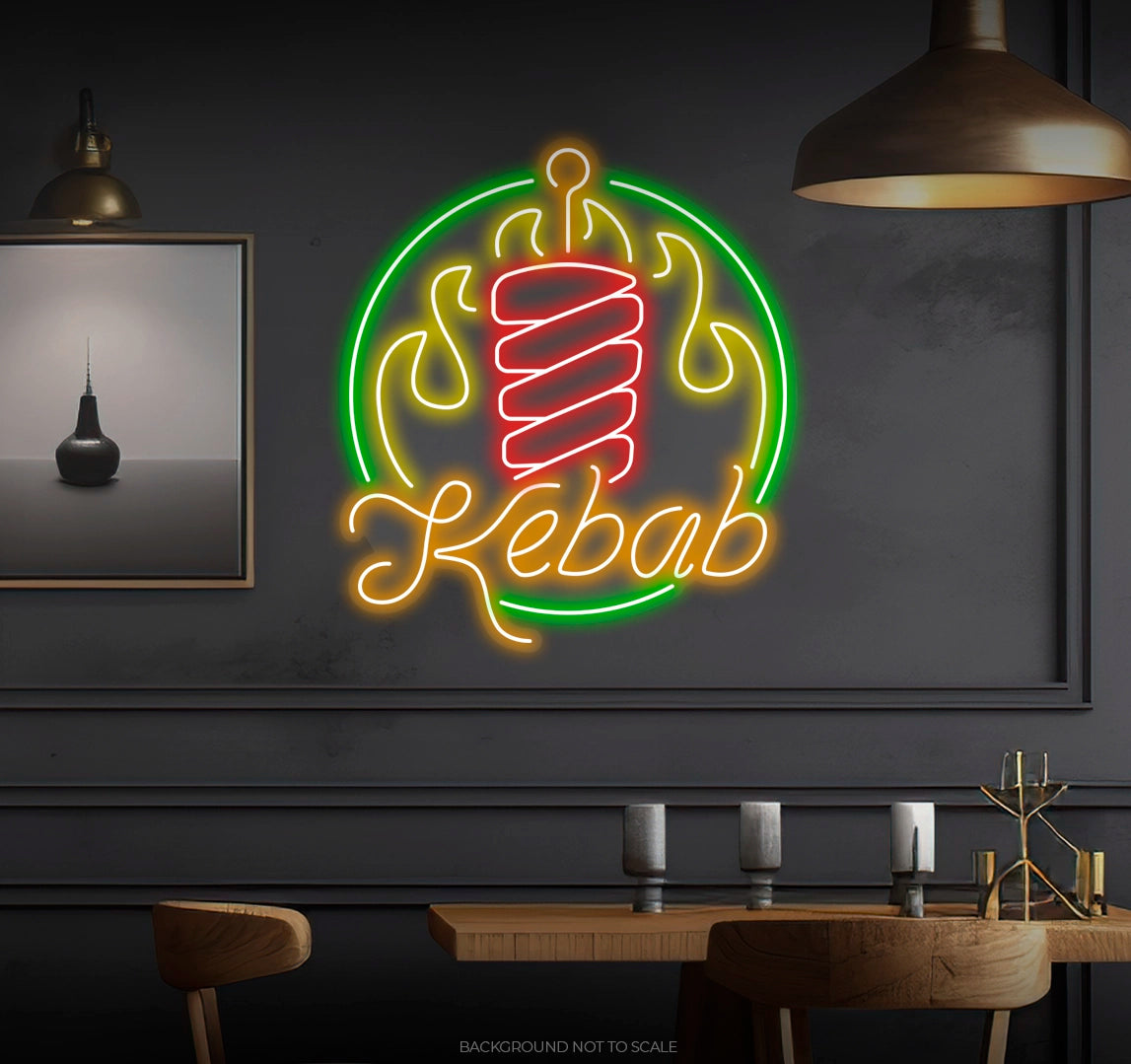 Don't miss this opportunity to celebrate your love for this beloved dish. Order your "Flaming Kebab Circle" LED Neon Sign today and let the aroma of sizzling goodness fill your space!