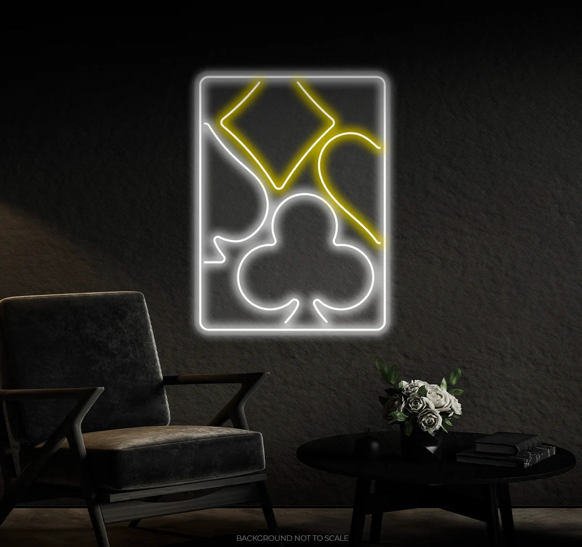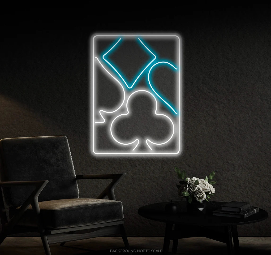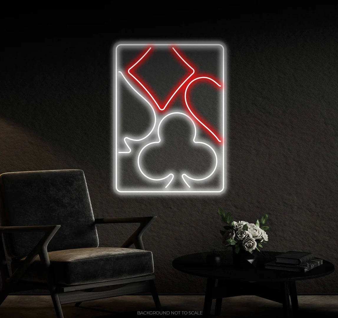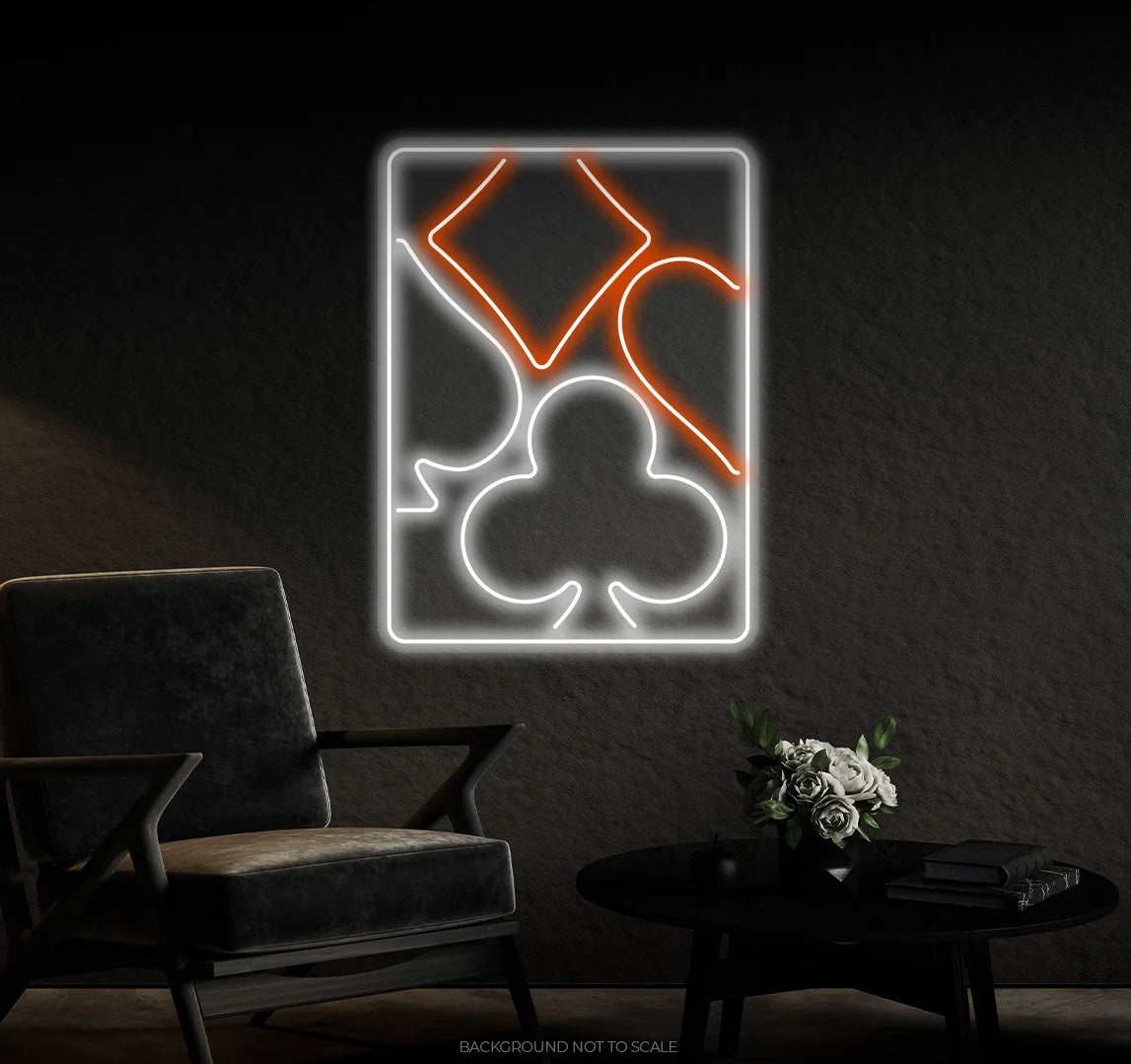 Striking Neon Design: Featuring all four playing card symbols, this LED neon sign lights up your space with a dynamic and energetic glow. Whether you're a poker enthusiast or just love the bold aesthetic of card games, this design is a winning choice.