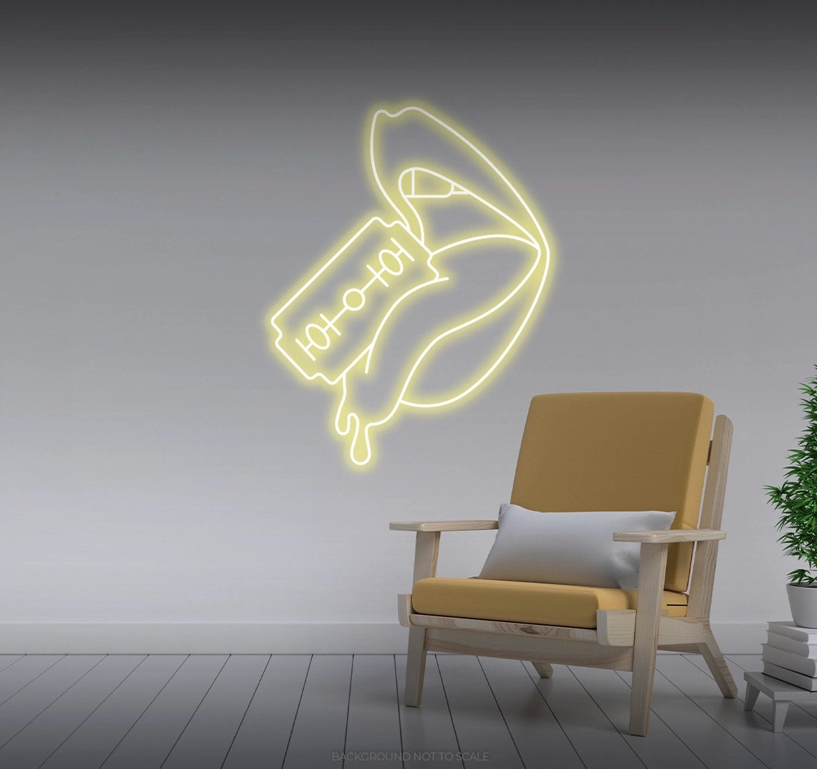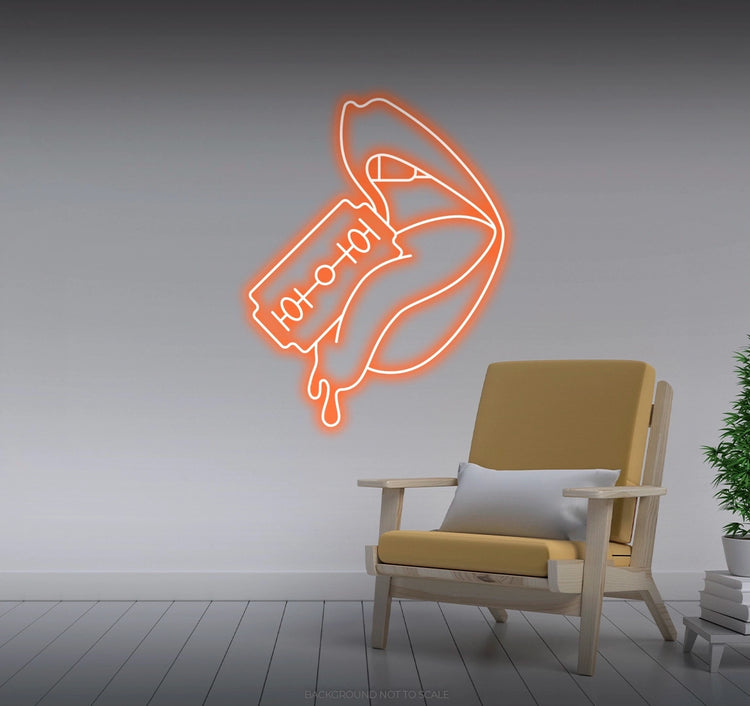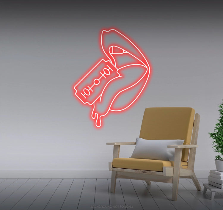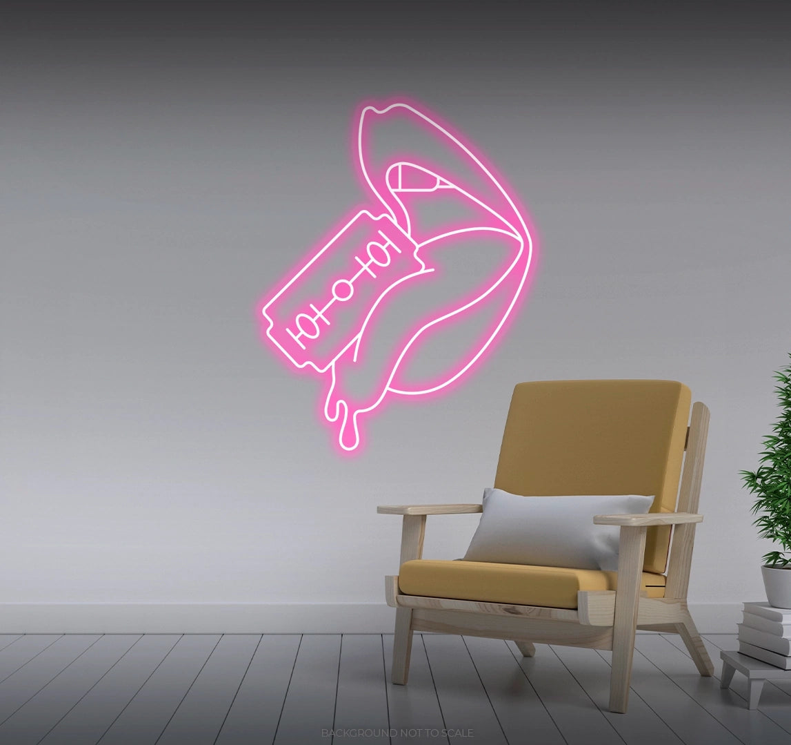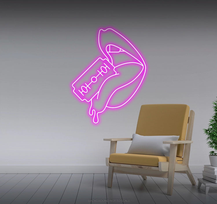 Illuminate your space with fearless creativity. Order the Razor Blade Cutting Woman's Tongue LED Neon today and let its daring glow redefine your decor!