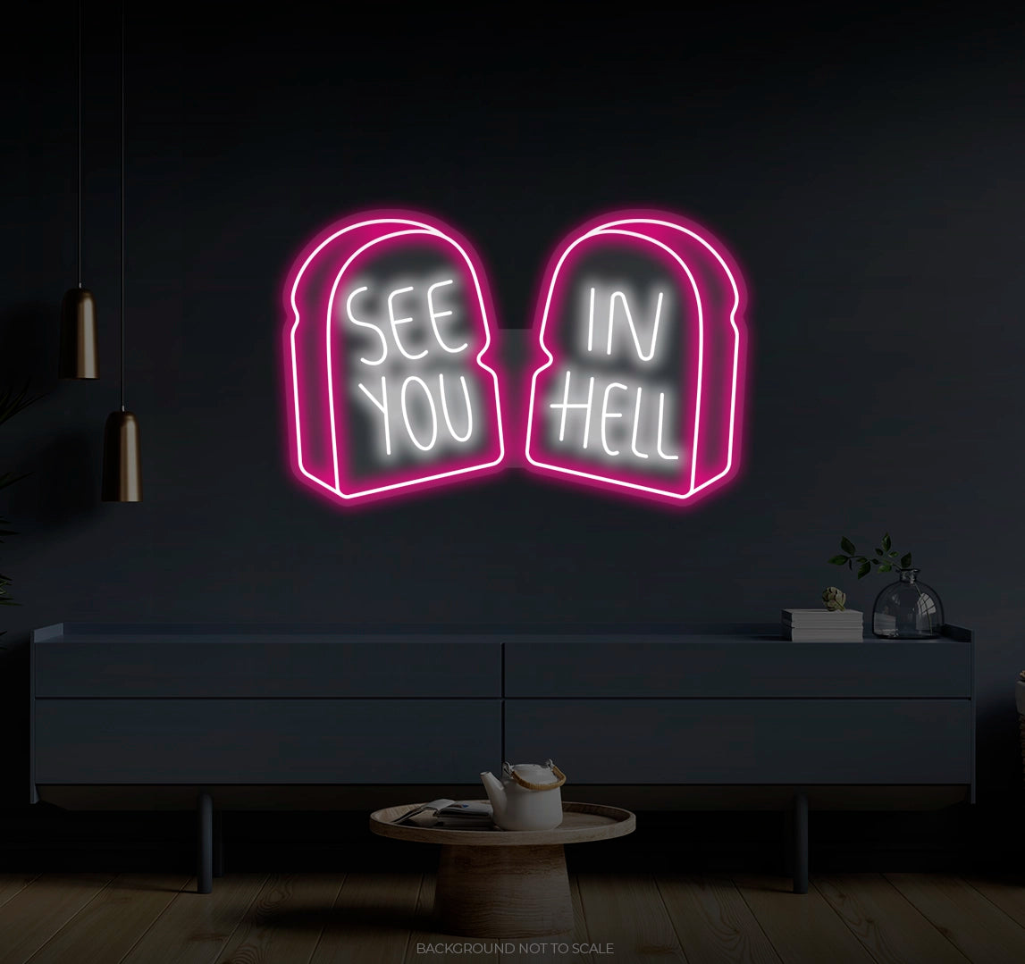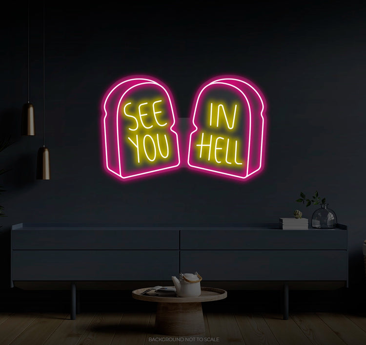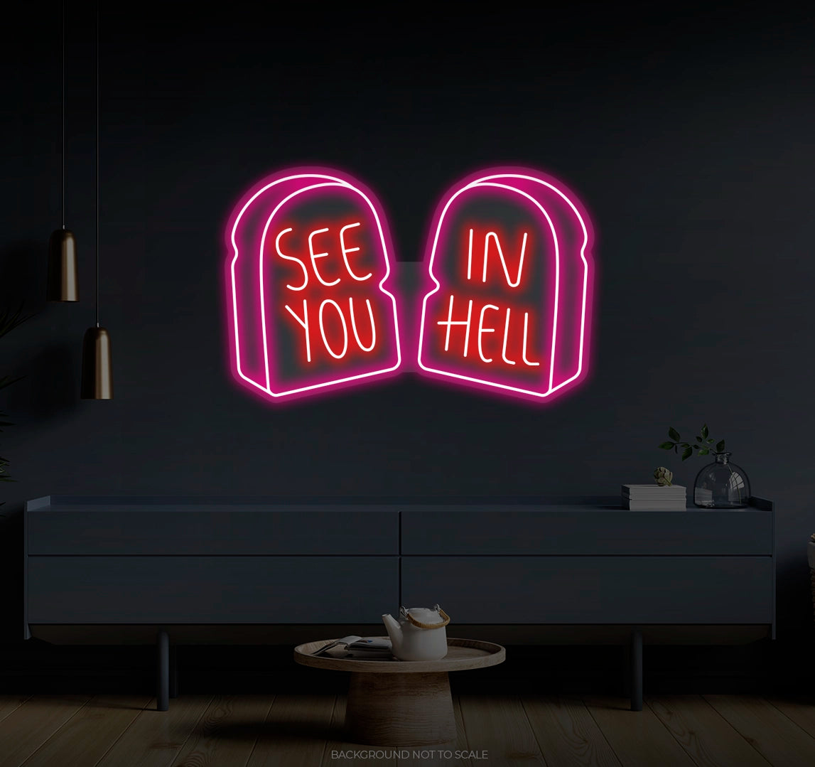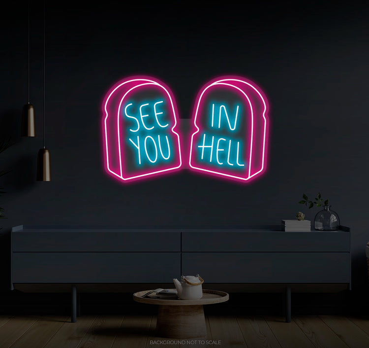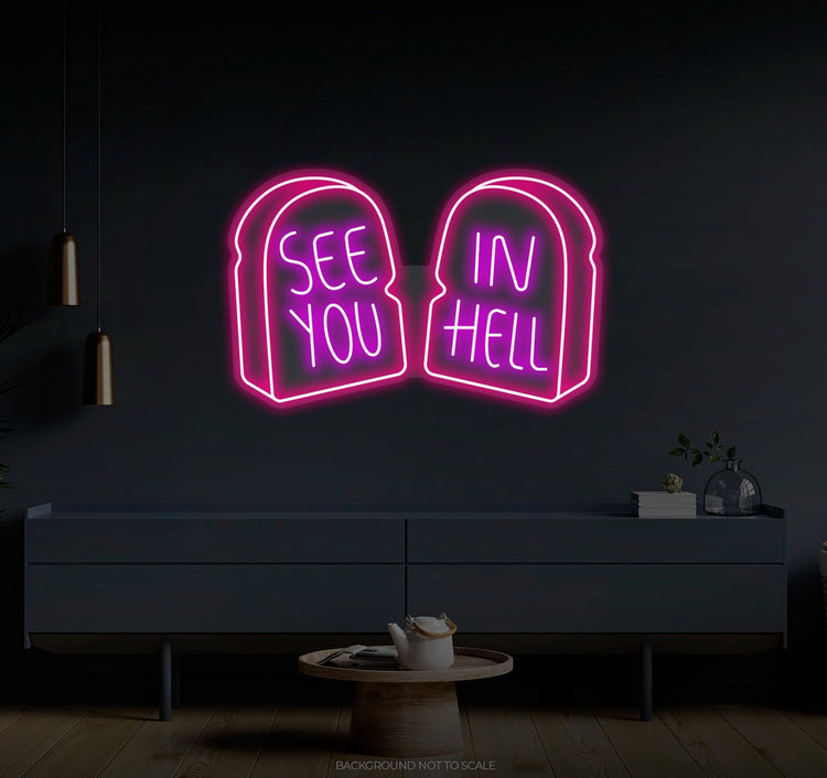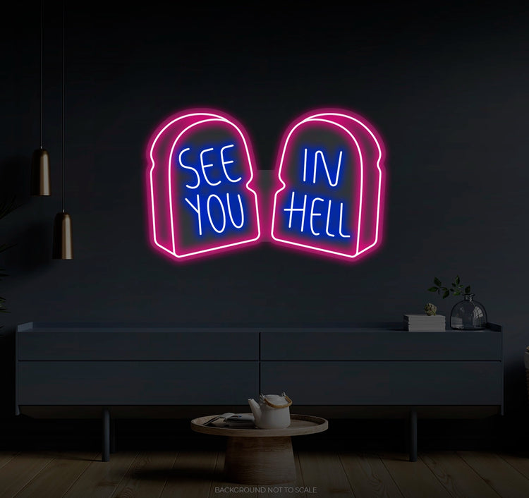 See You In Hell Signage Elegance: Illuminate your environment with the captivating glow of our "See You In Hell" LED Neon. It not only lights up but also radiates the spirit of boldness and individuality, embodying the essence of your unique taste.