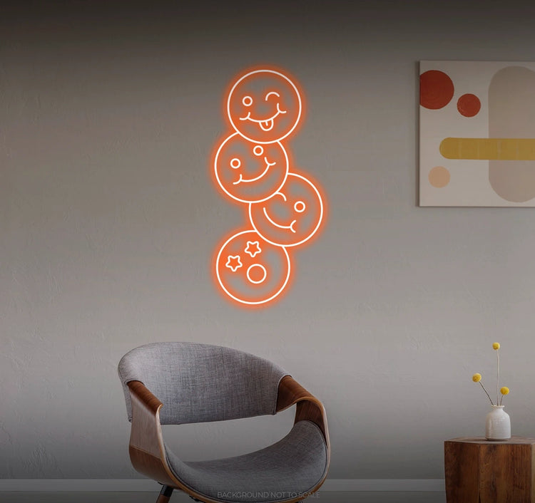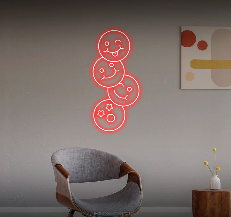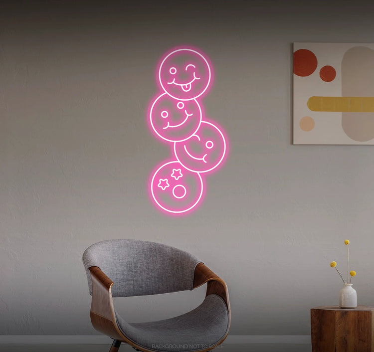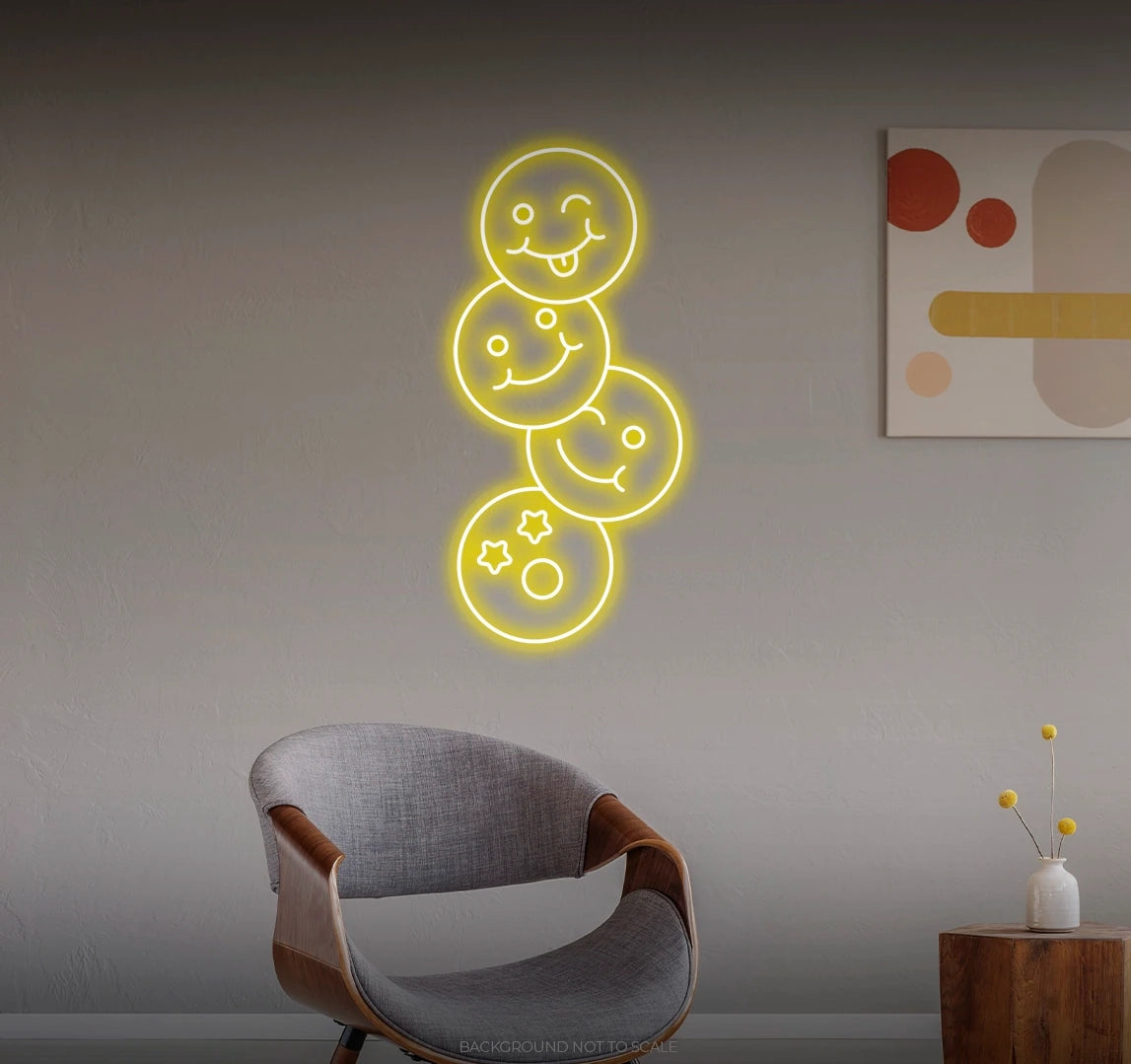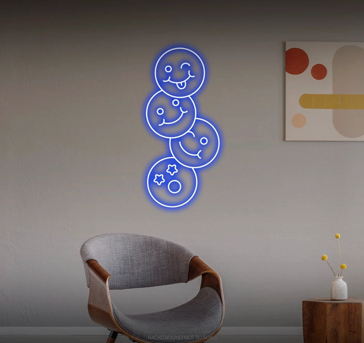 Timeless Whimsy Expression: Infuse your space with the perpetual allure of "Smileys in Line" LED Neon. It's not just a decorative piece; it's a tribute to the timeless joy that emanates from the whimsical world of smiling emojis, illuminated by the captivating glow of the LED Neon.