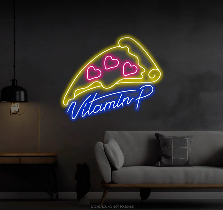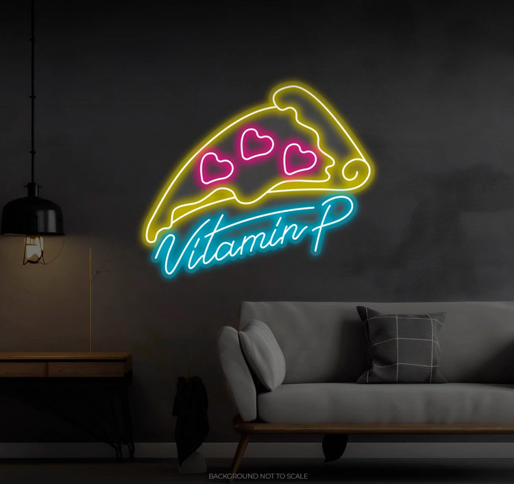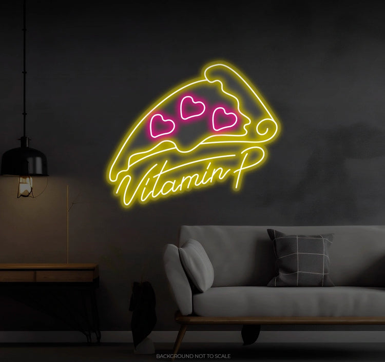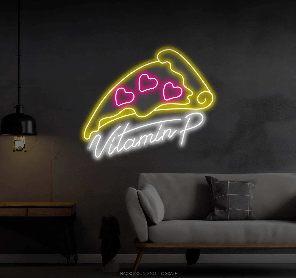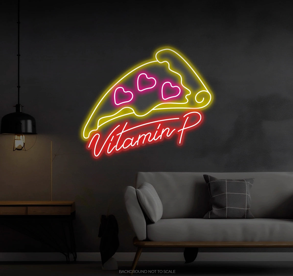 Pizza & Heart Design: The neon features a vibrant pizza slice with the text "Vitamin P" cleverly integrated into the design, with hearts surrounding the pizza to convey the love and joy that pizza brings. The combination of food and love is sure to put a smile on anyone’s face.