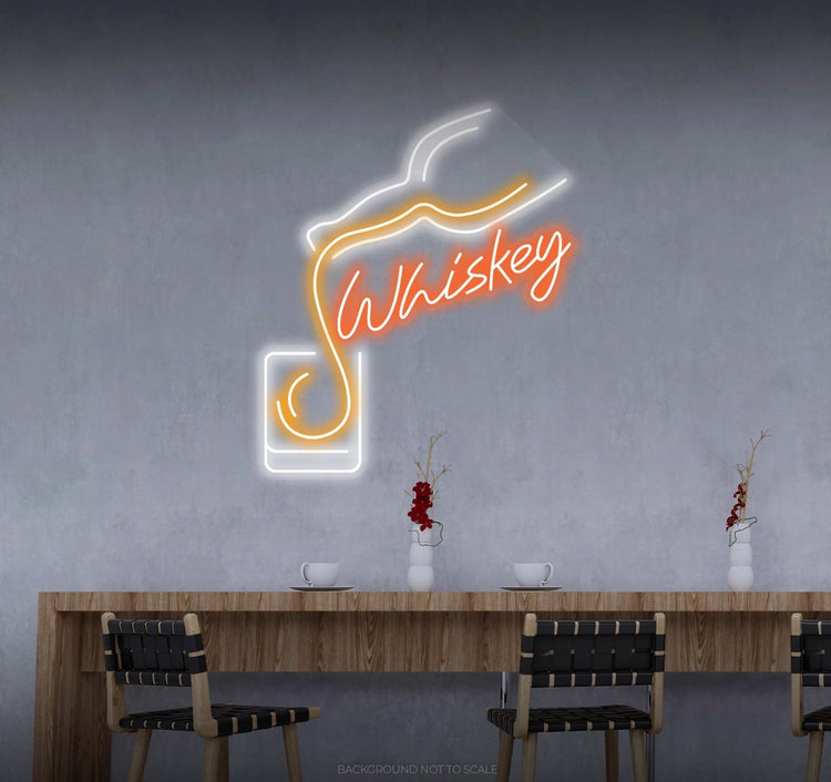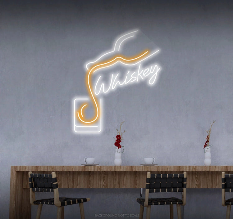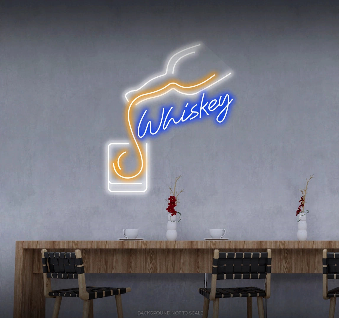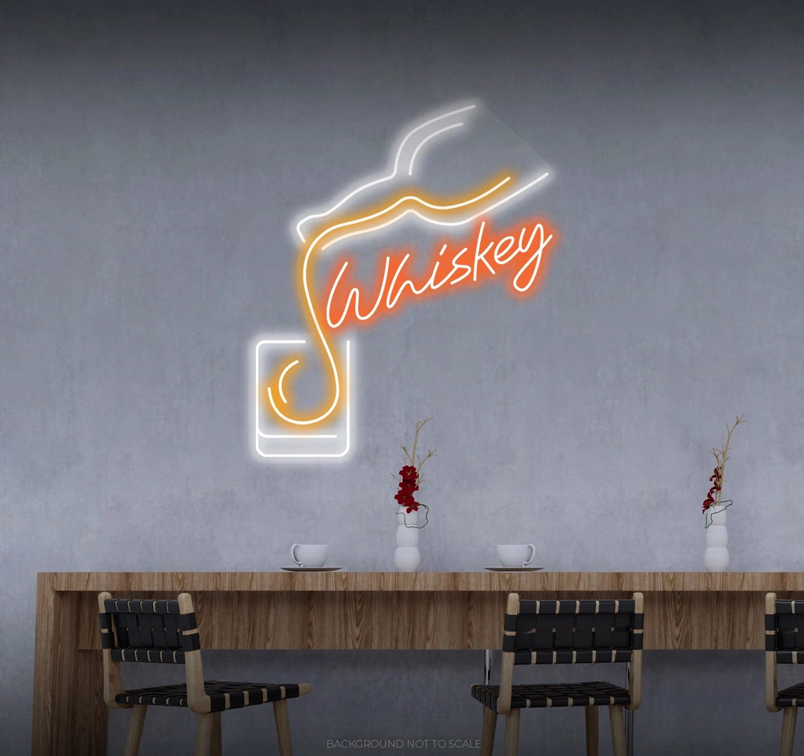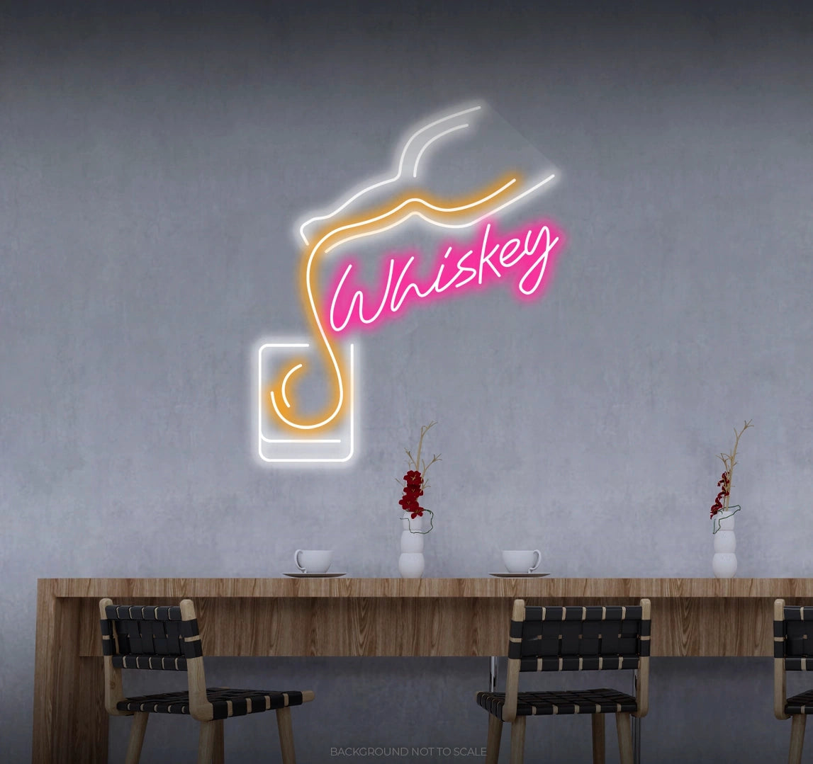 - Watch as our LED neon sign lights up your space with an elegant and warm glow, capturing the artistry of a whiskey pour.
