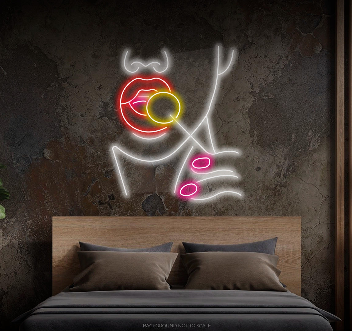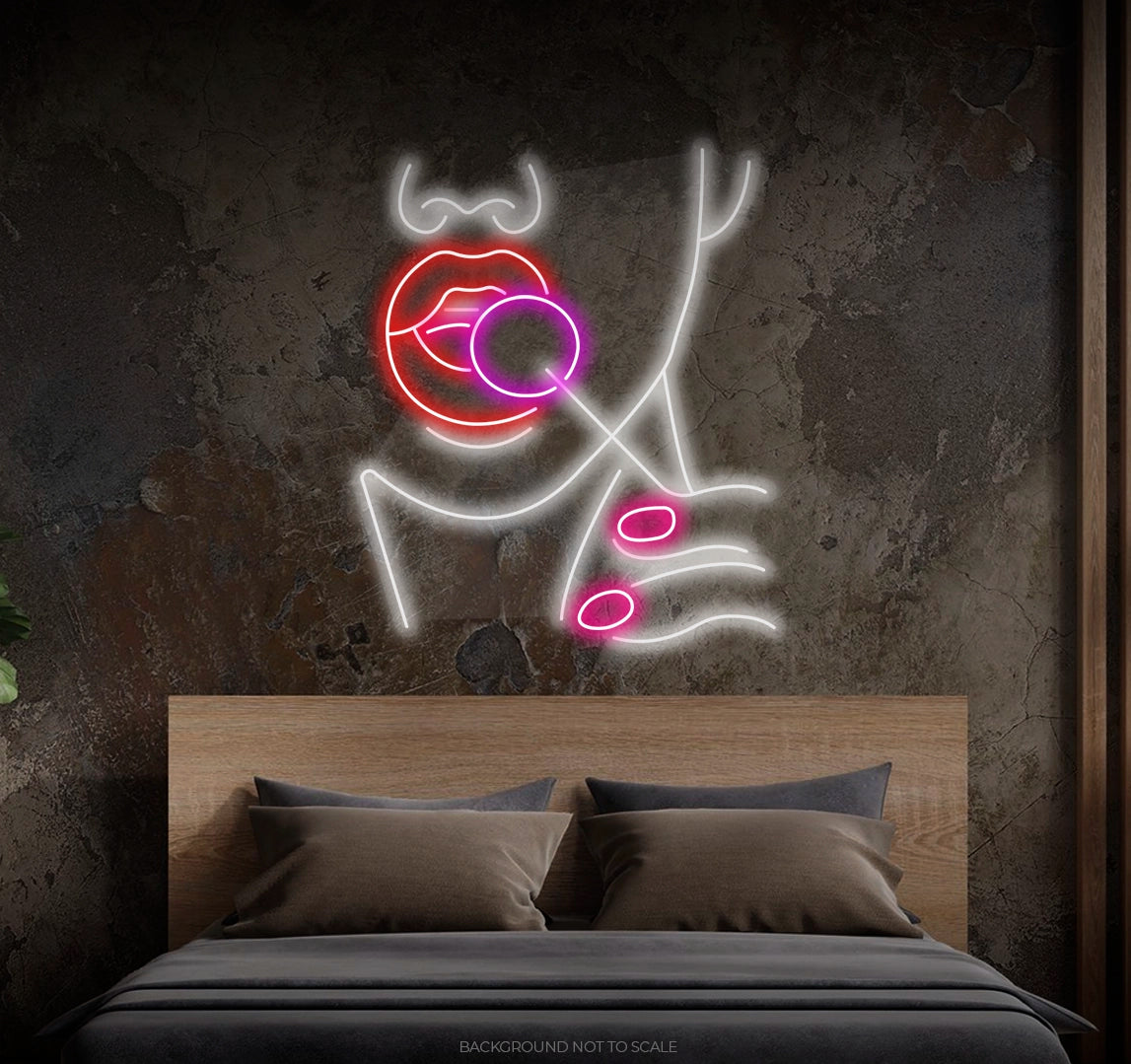 Sensual Neon Radiance: Our LED neon sign beautifully combines the sultry glow of neon lighting with the playful charm of a lollipop, harnessing the energy-efficient and long-lasting benefits of modern LED technology. Immerse yourself in its alluring illumination that instantly transforms your surroundings into a haven of beauty and playfulness.