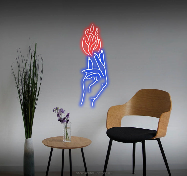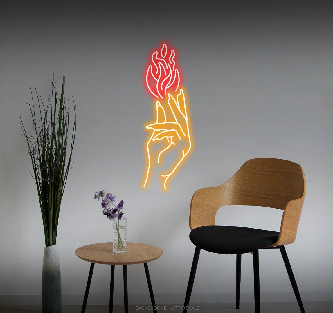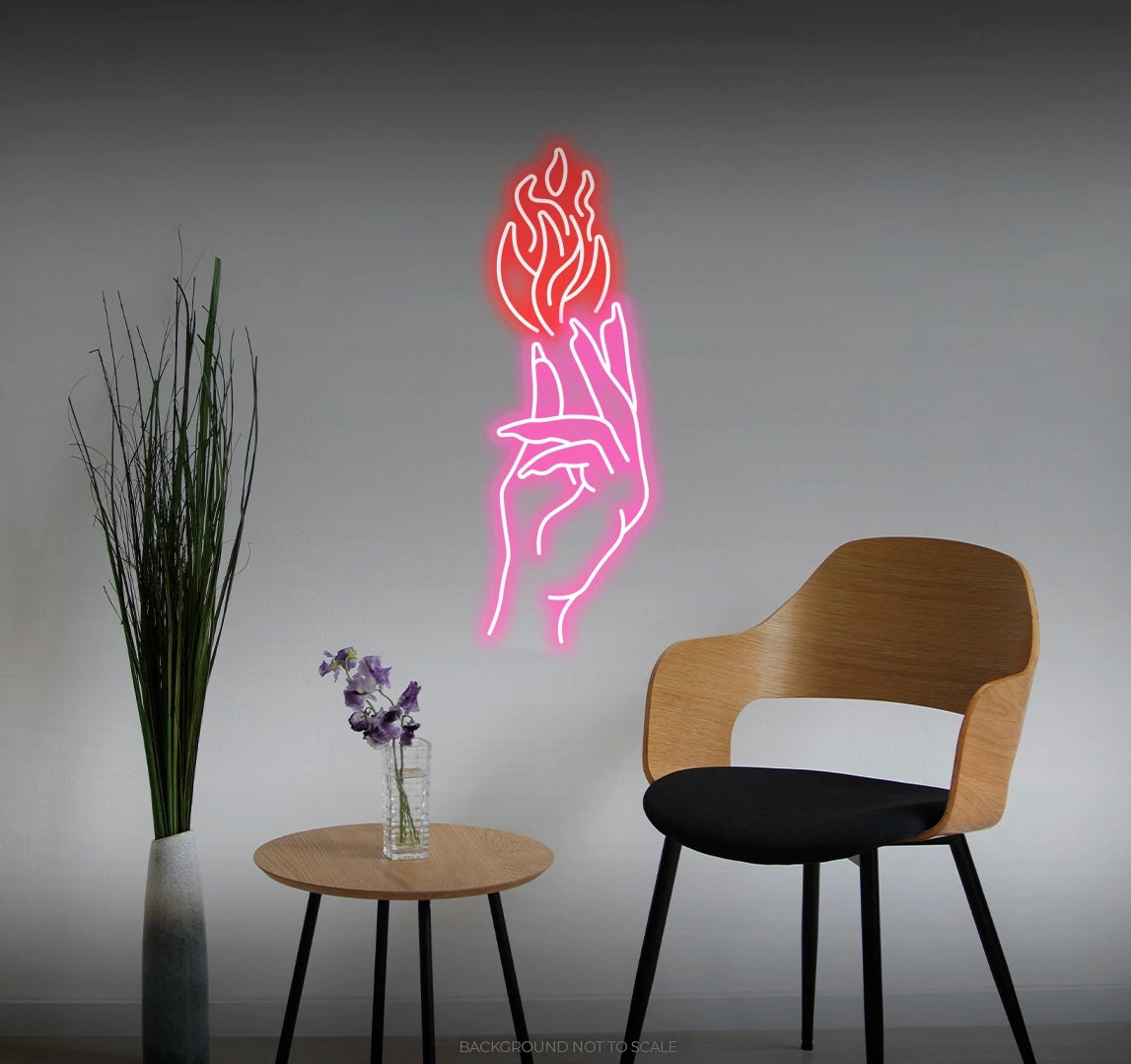Fiery Elegance: Immerse your space in the enchanting glow as our LED neon sign artfully captures the silhouette of a woman's hand intertwined with flames, embodying a potent blend of intensity and elegance in a captivating image.