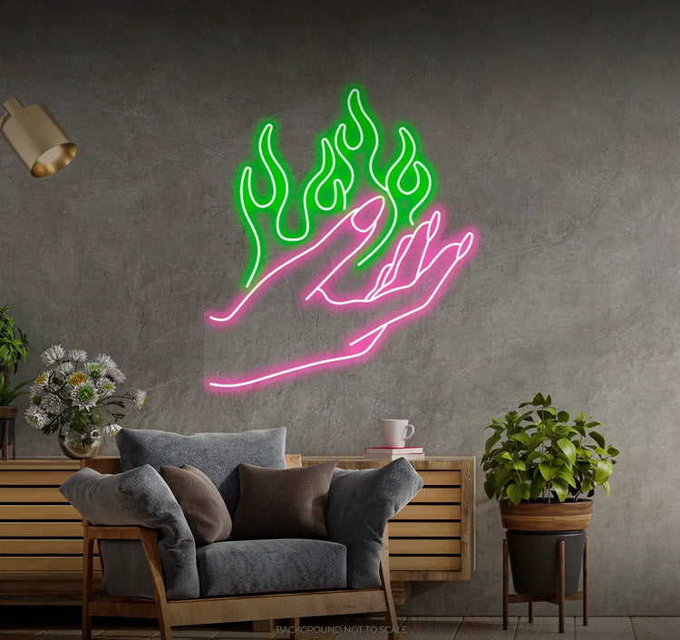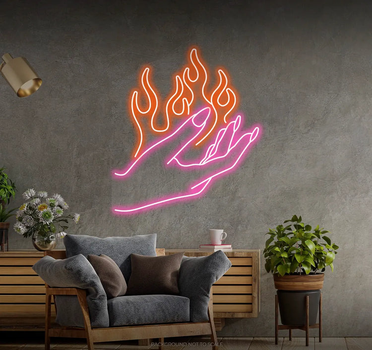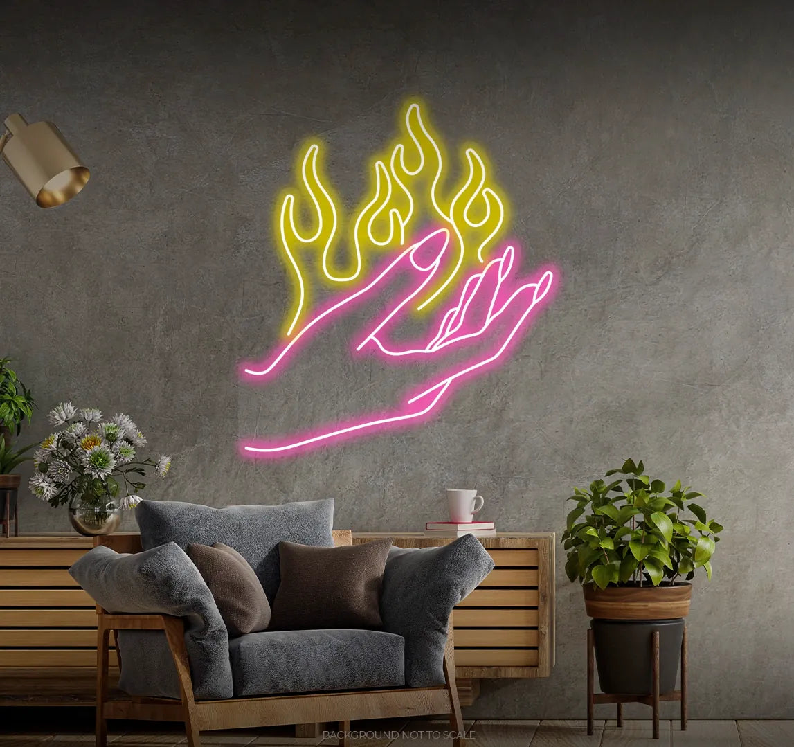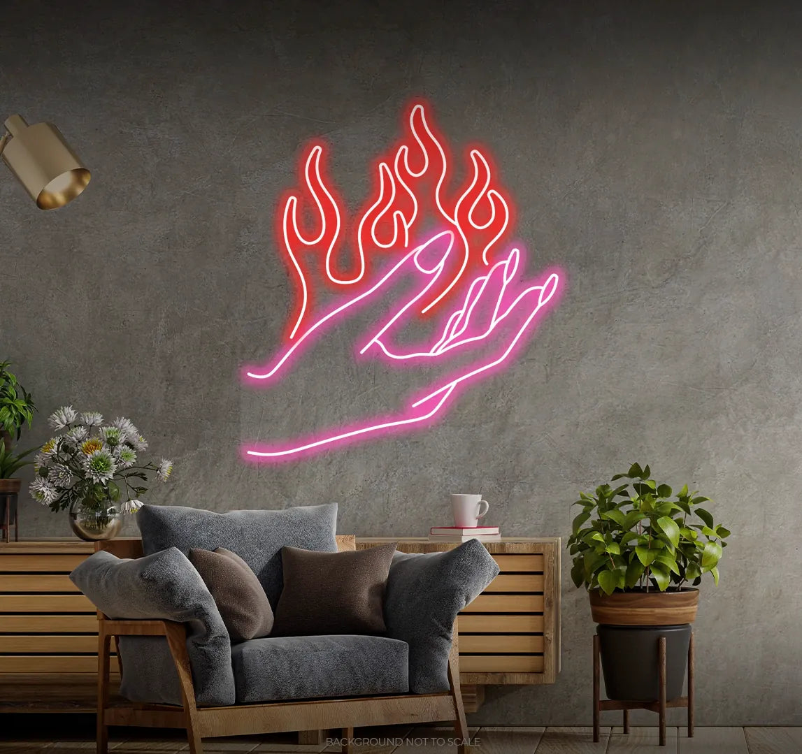 Dynamic Signage Splendor: Illuminate your space with the intense glow of our LED neon sign. It doesn't just light up; it radiates with the dynamic charm of a hand surrounded by flames, capturing the essence of strength and vibrancy.