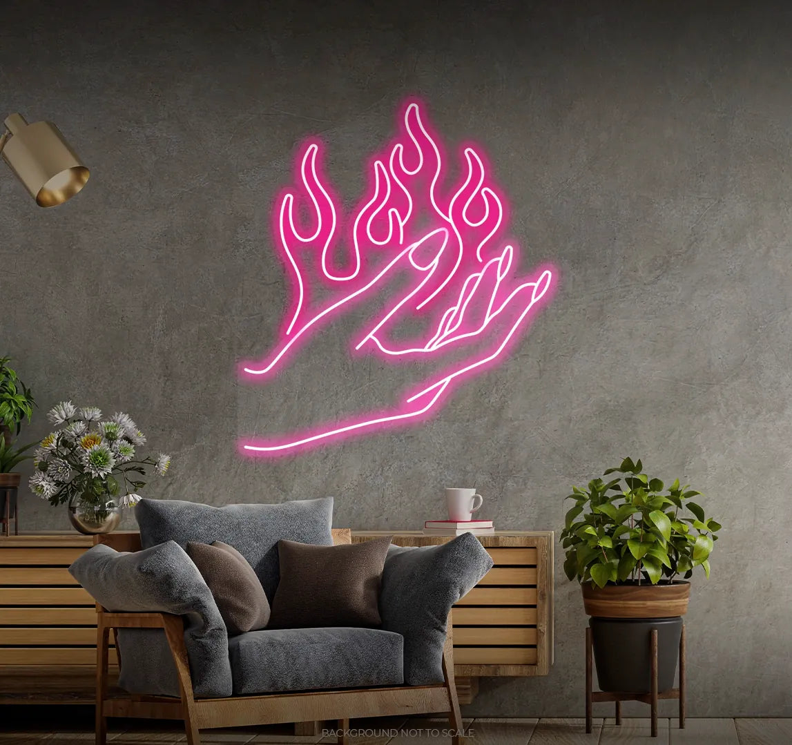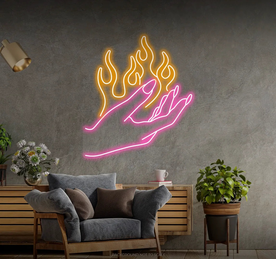 Fiery Elegance: Immerse your space in the enchanting glow as our LED neon sign artfully captures the silhouette of a woman's hand surrounded by flames, embodying a potent blend of intensity and elegance in a captivating image.