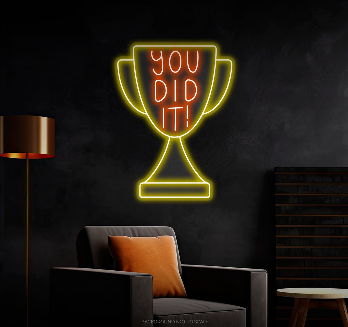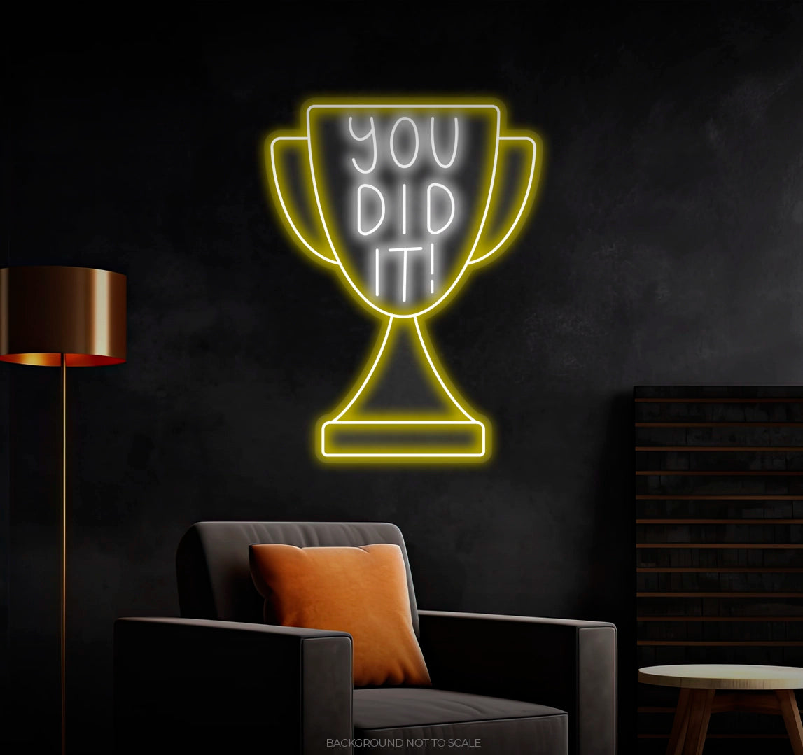 Bright and Celebratory Glow: Light up your room with the triumphant glow of our "You Did It Trophy" LED Neon. The sign emits a vibrant light that energizes the space and serves as a constant reminder of your success, perfect for home offices, living rooms, game rooms, or any space where you want to celebrate your achievements.