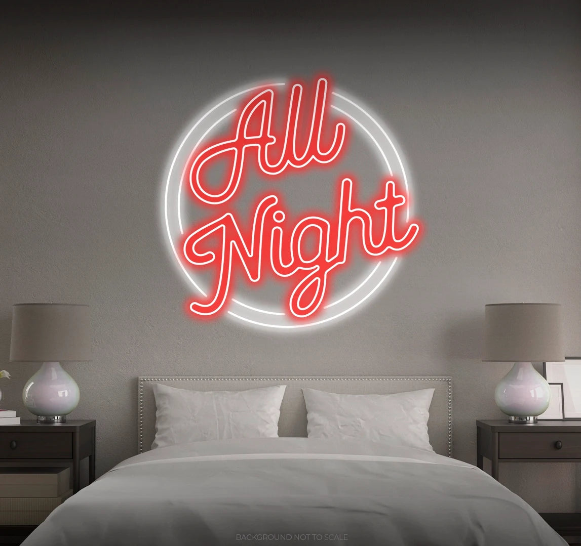 Endless Nighttime Glow: Watch as our LED neon sign bathes your space in an eternal, captivating glow, embodying the ceaseless spirit of the All Night Circle. Revel in the perpetual radiance that transforms your surroundings into an everlasting celebration of nighttime energy.