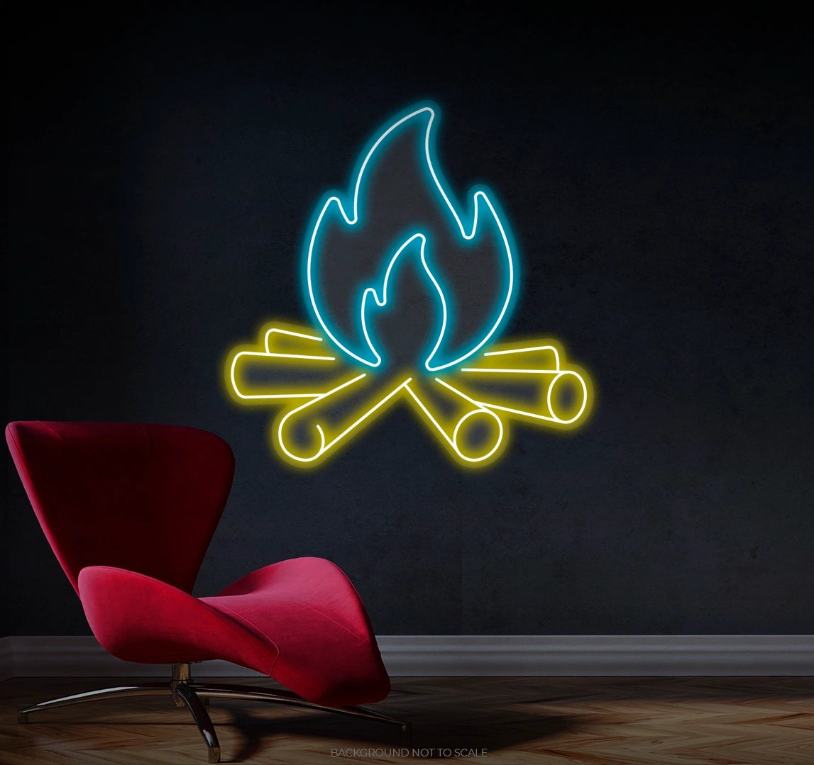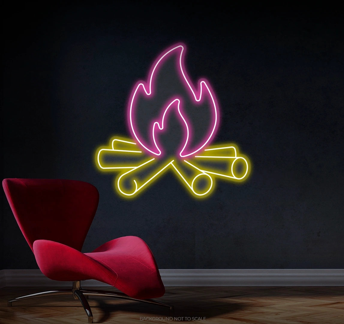 Cozy Fire Design: A carefully crafted neon representation of a bonfire with flickering orange and yellow hues, mimicking the warmth and glow of an actual fire.