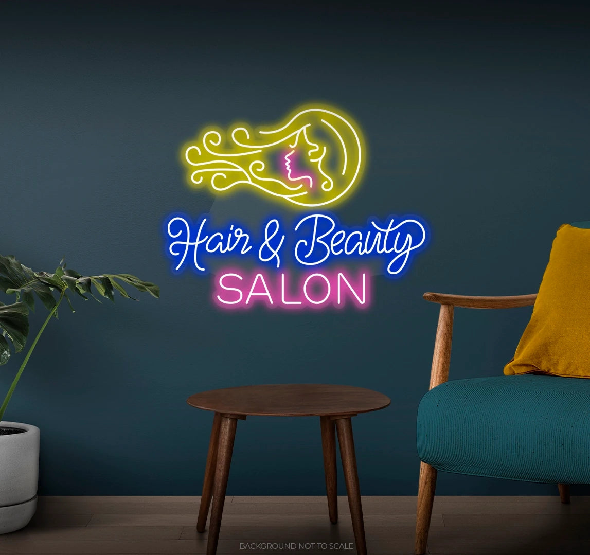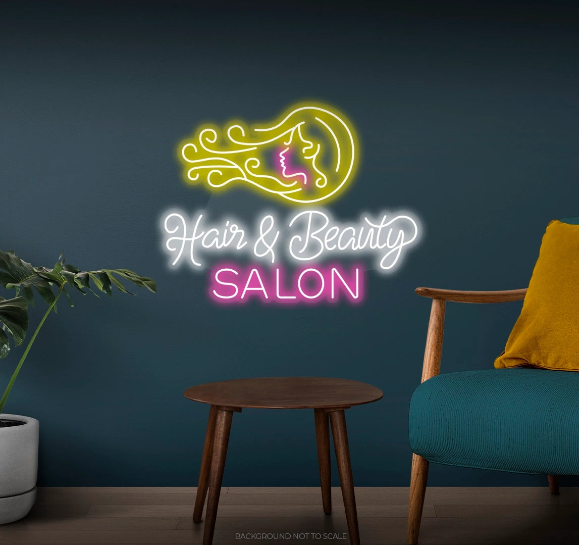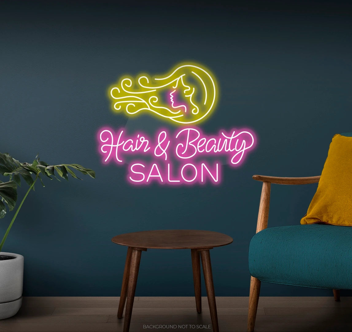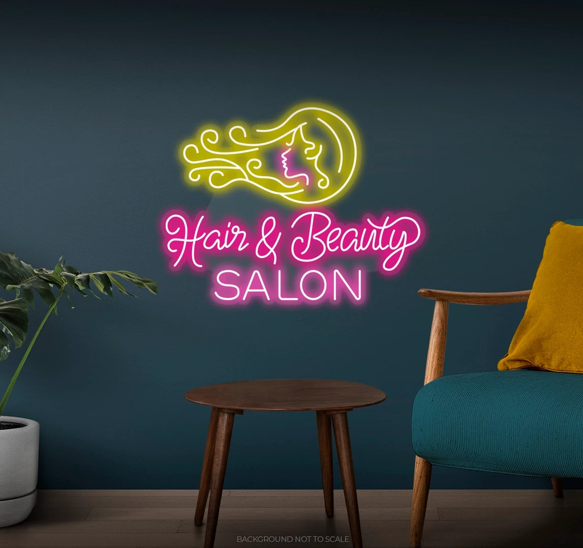 Glamorous Glow: Watch as our LED neon sign bathes your salon in a glamorous glow, showcasing the words "Hair & Beauty Salon" in an elegant and chic design. Immerse yourself in the stylish allure that turns your salon into a unique retreat, providing a touch of delightful joy for clients seeking beauty transformations.