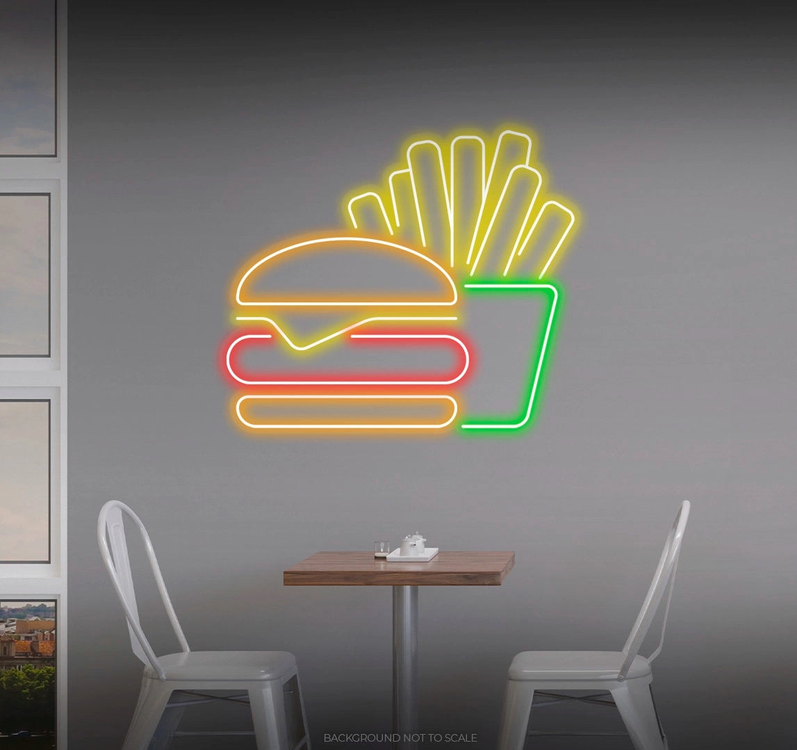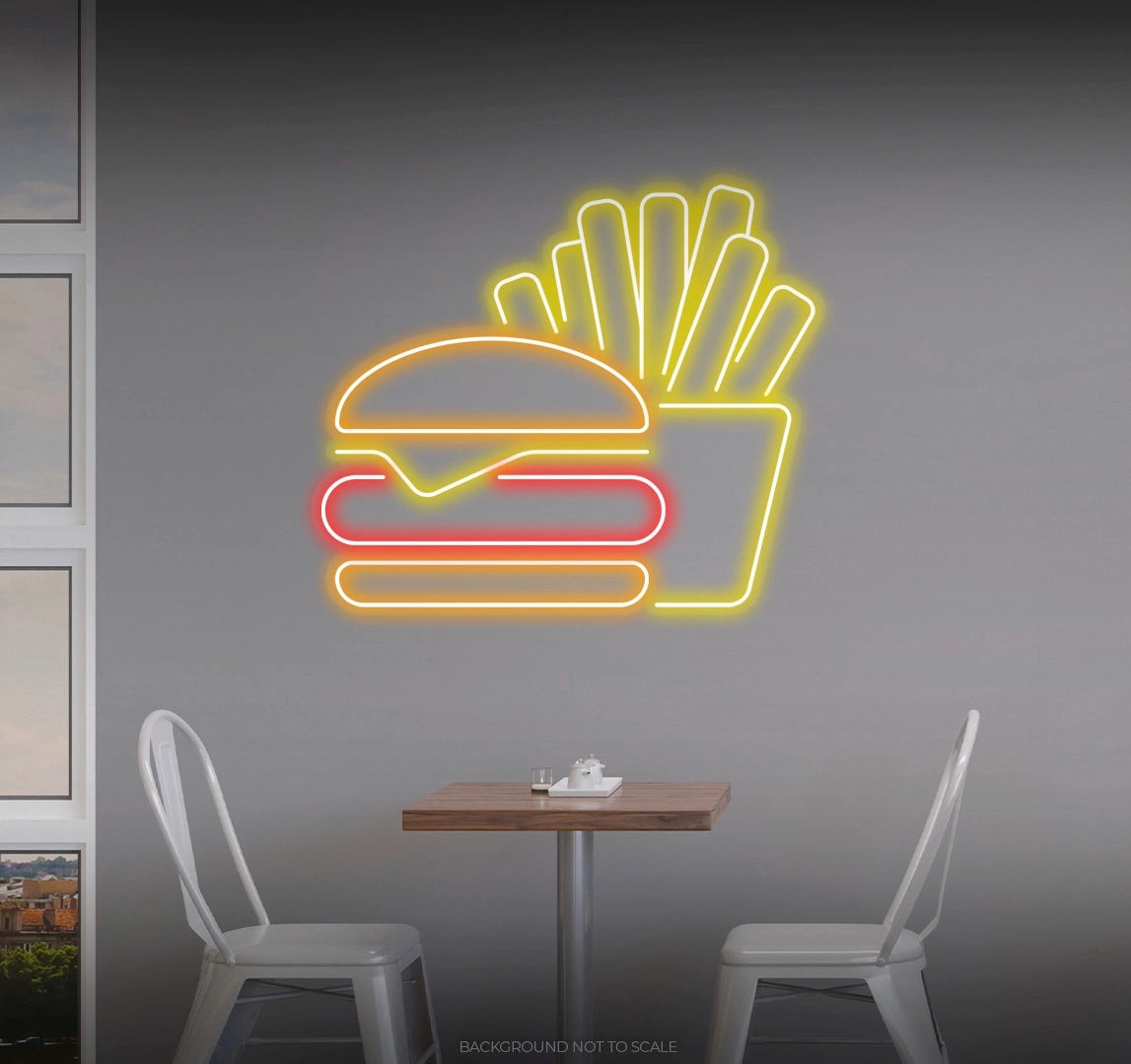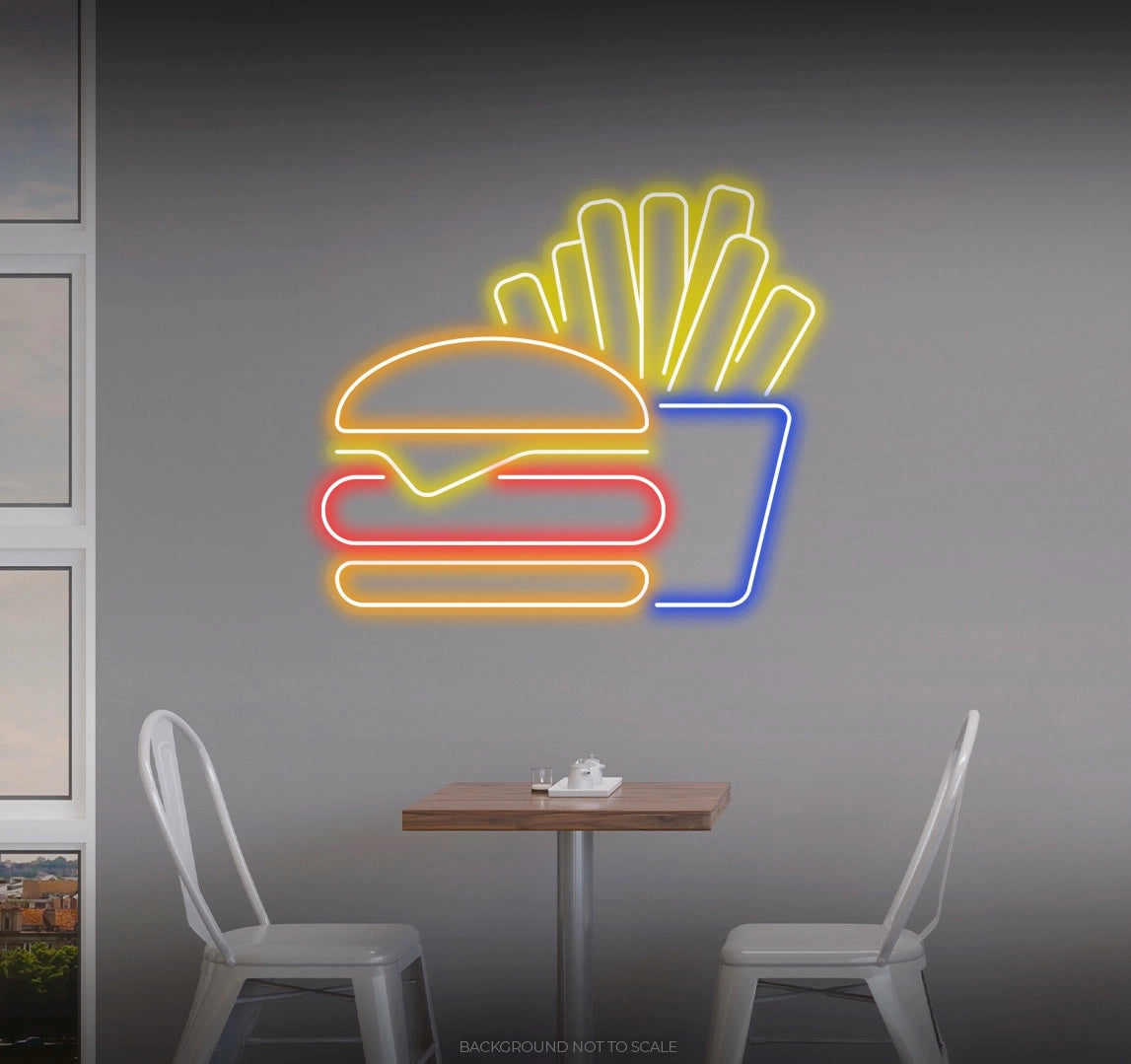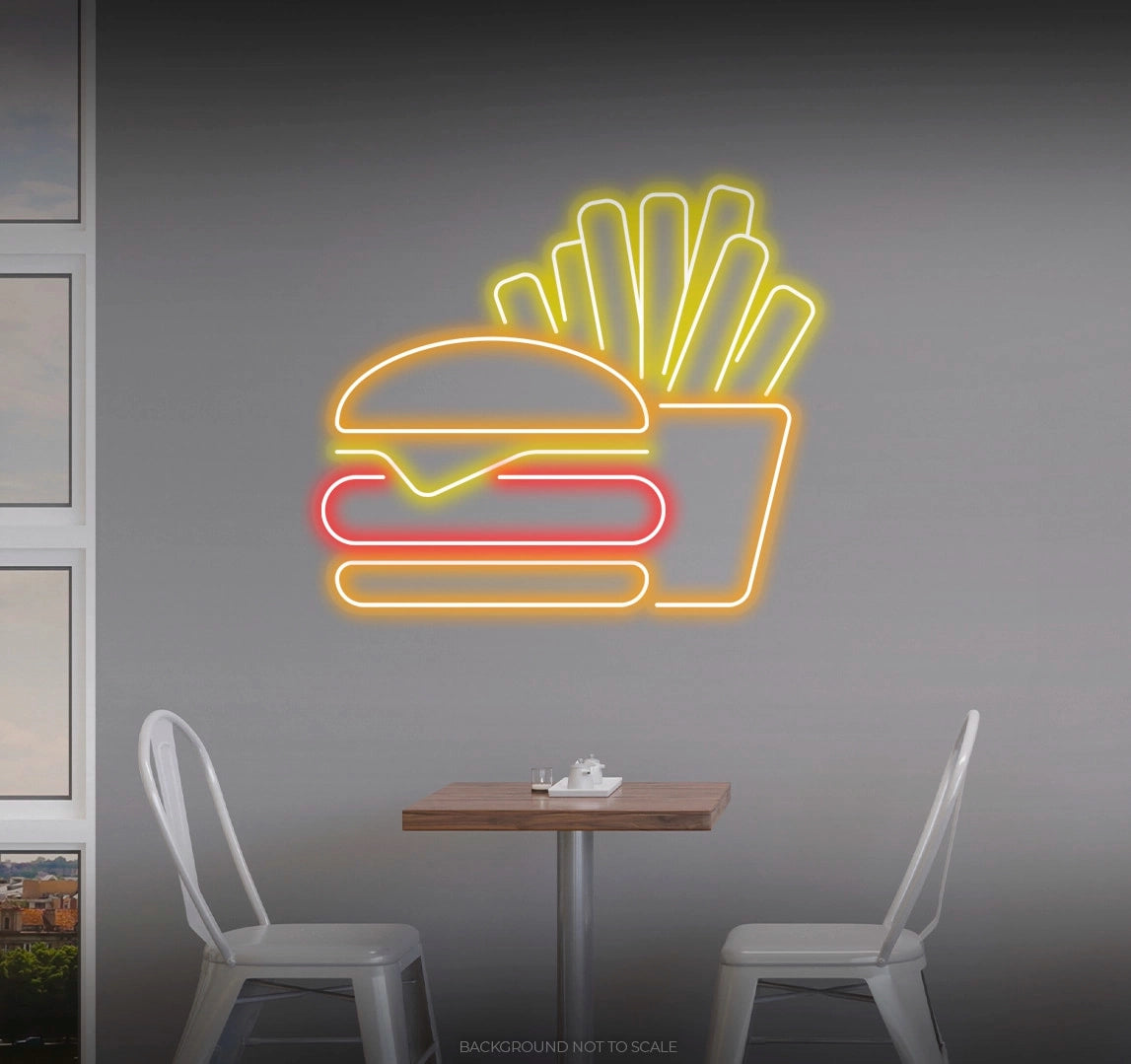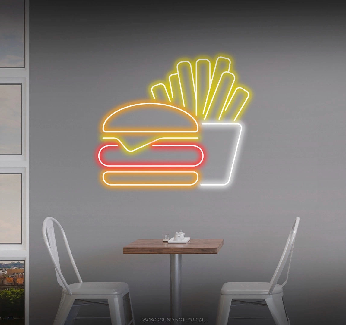 Customizable Culinary Hues: Personalize your neon sign with an array of culinary-inspired colors and sizes. Tailor it to complement your space or create a combination that resonates with the tempting and delicious ambiance of "Hamburger & French Fries."