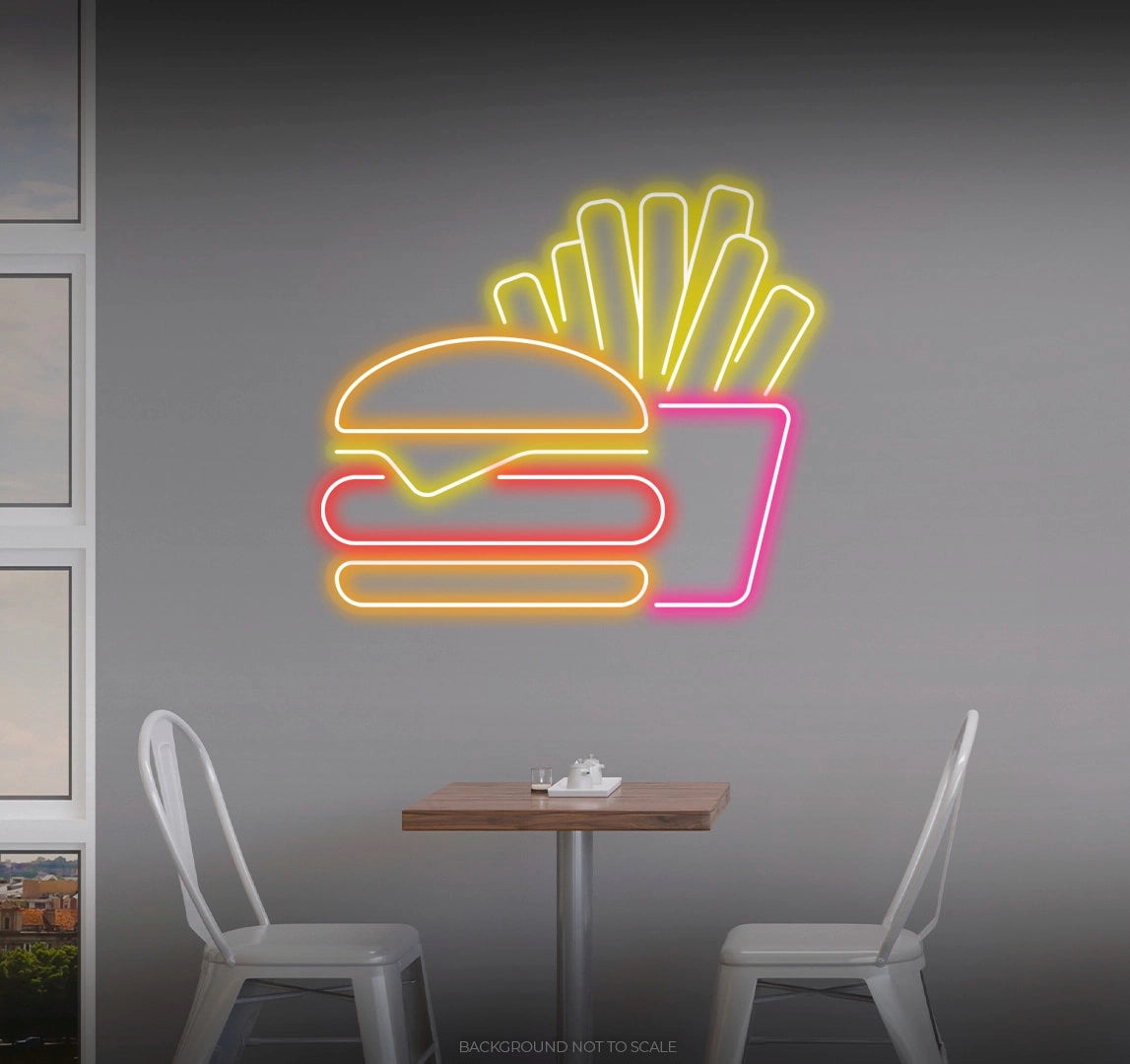 Tempting Glow: Watch as our LED neon sign bathes your space in a tempting glow, showcasing a delectable hamburger and golden french fries. Immerse yourself in the savory allure that turns your surroundings into a unique retreat, providing a touch of delightful joy for food lovers.