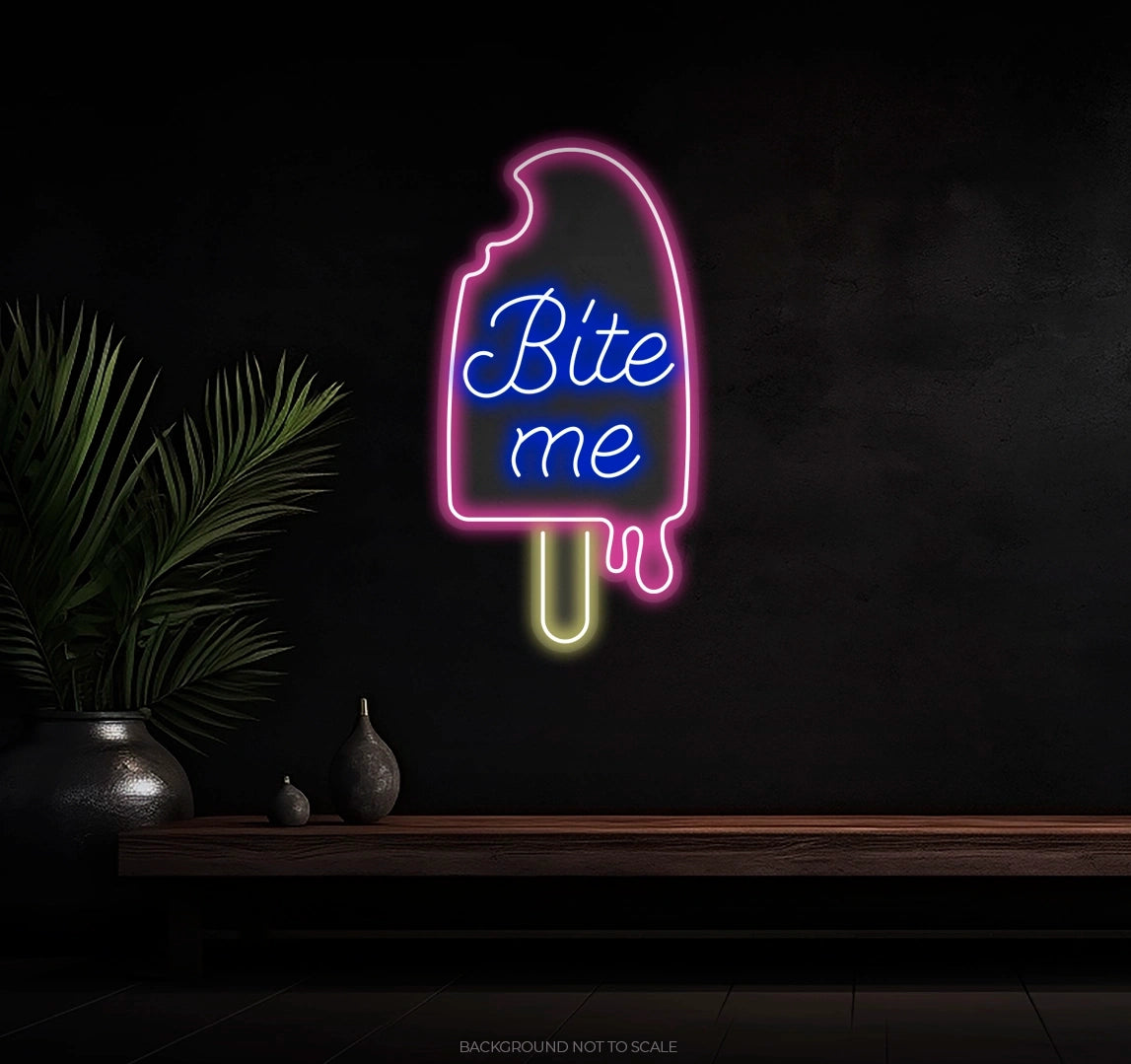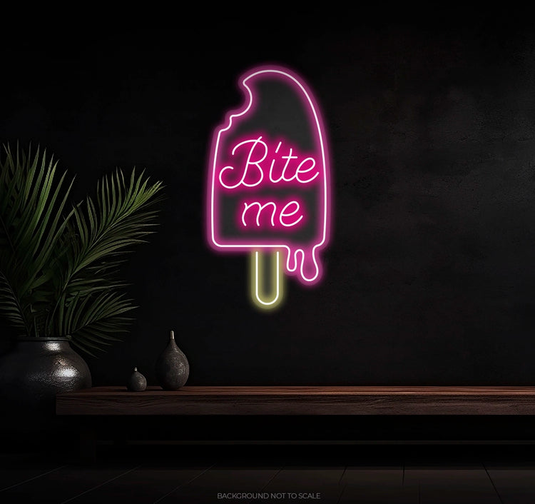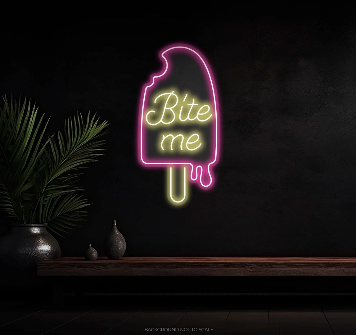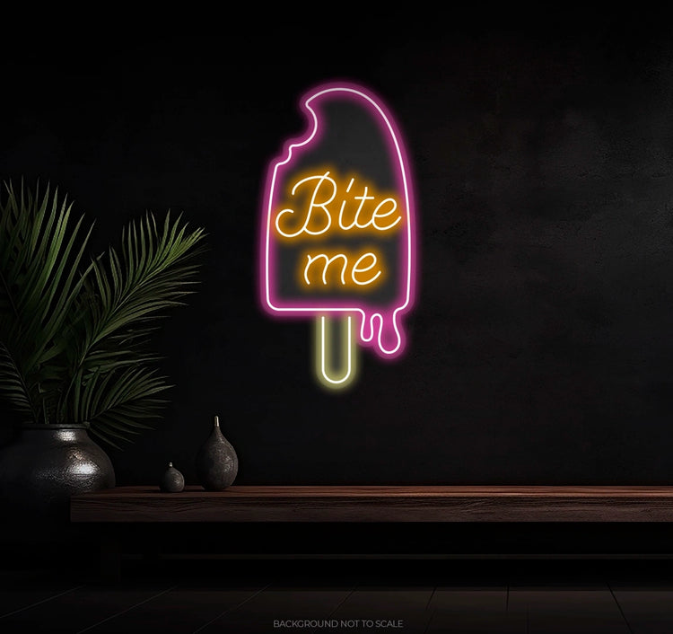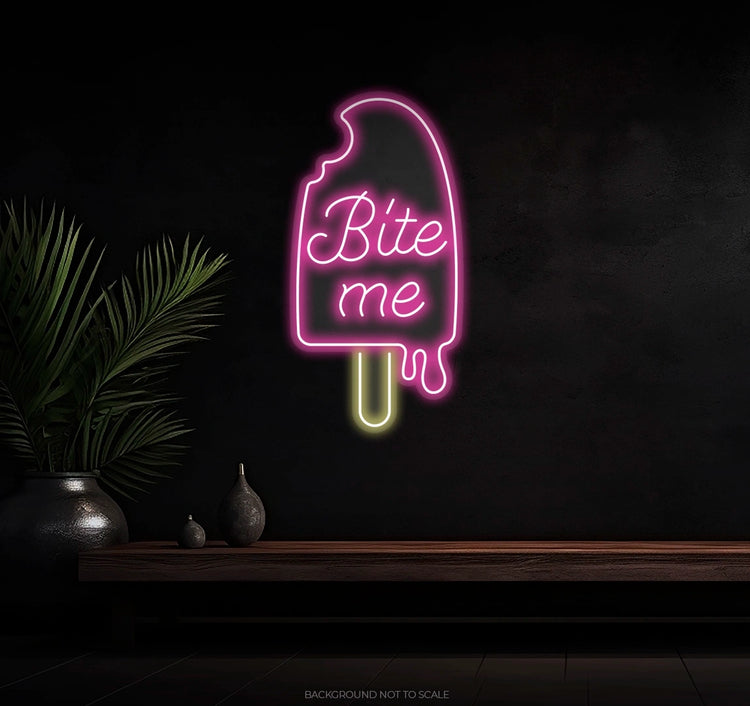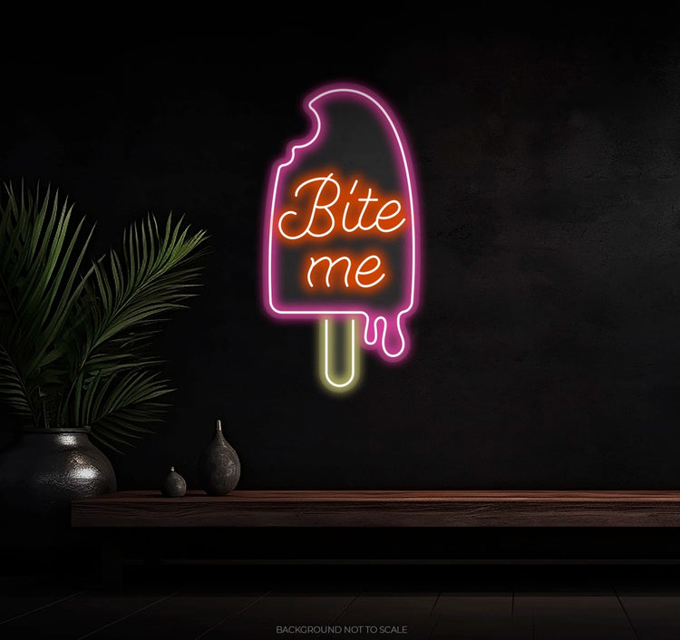 Deliciously Bright Glow: Transform your environment with the delightful radiance of our "Ice Cream Bite Me" LED Neon. This sign brings a fun and cheeky vibe to any room, making it an eye-catching focal point that’s sure to bring smiles.