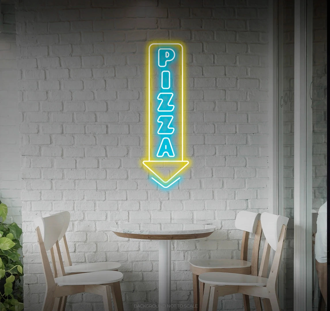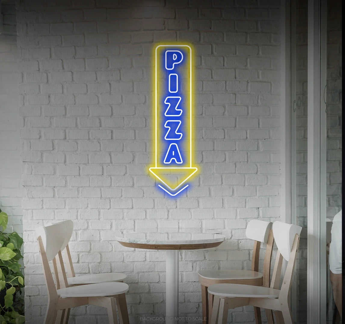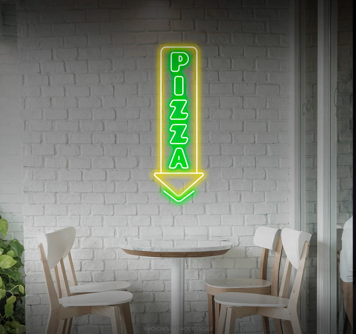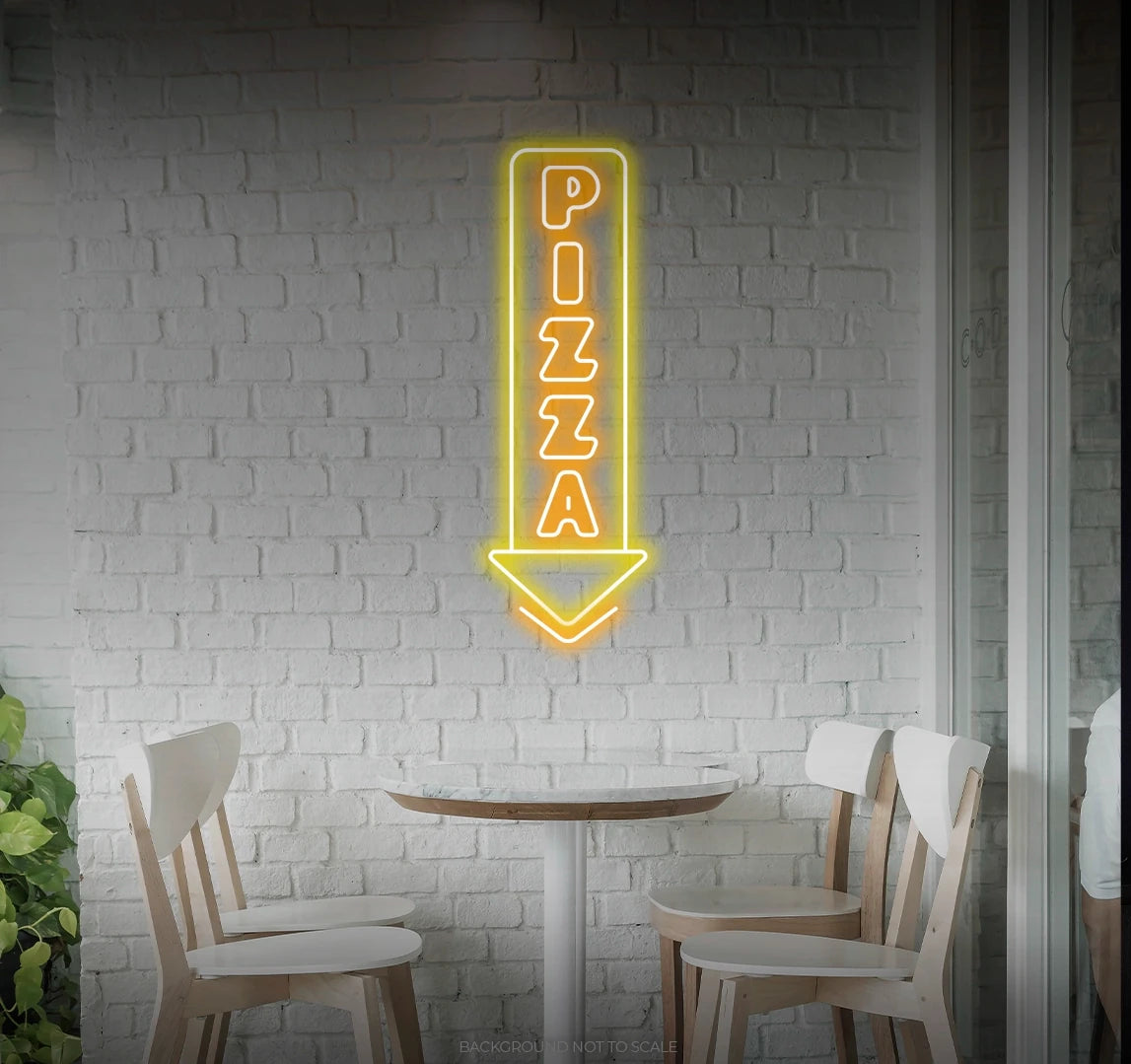 - Illuminate your space with the tempting presence of a neon pizza arrow, creating an atmosphere of culinary delight.