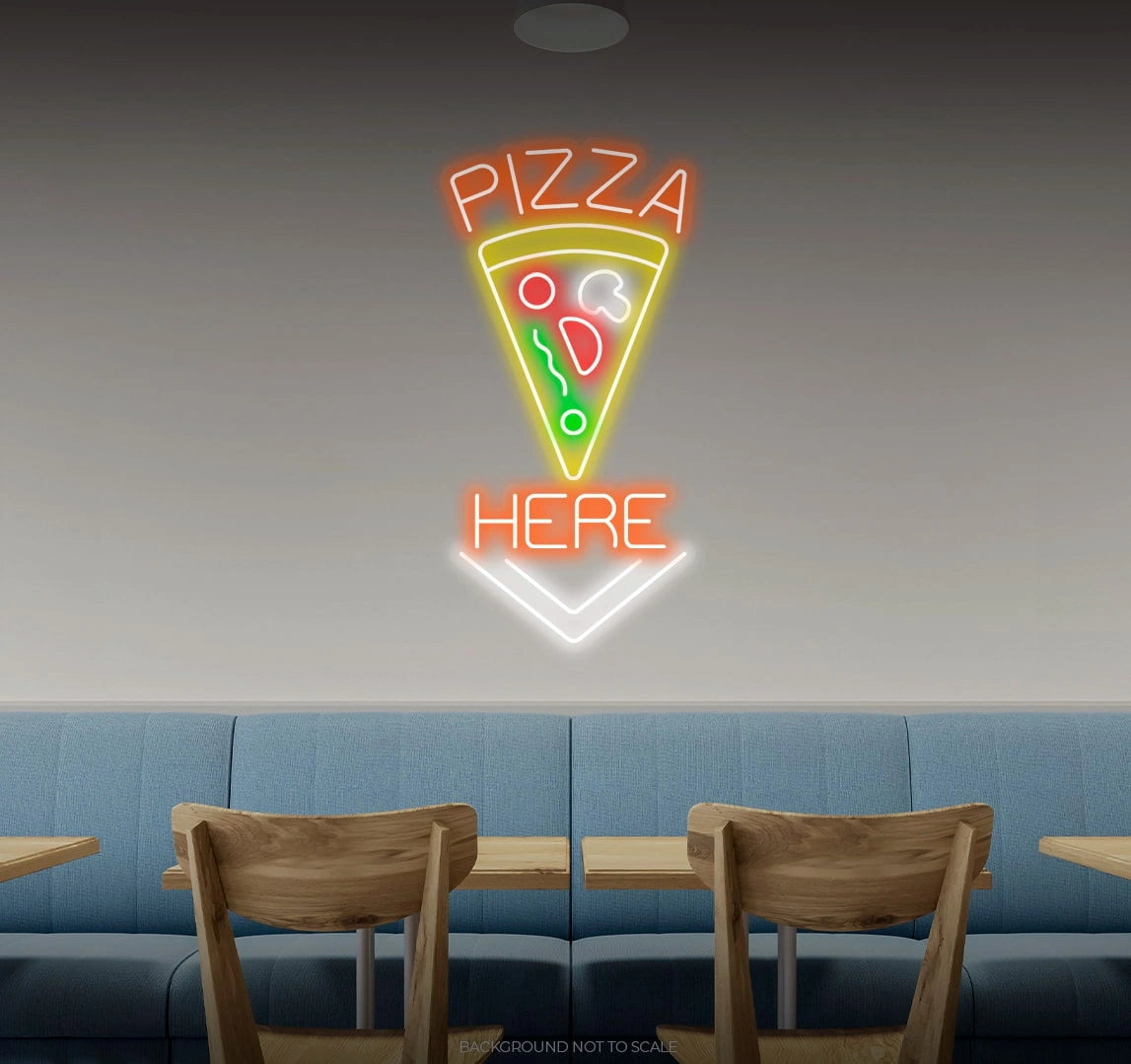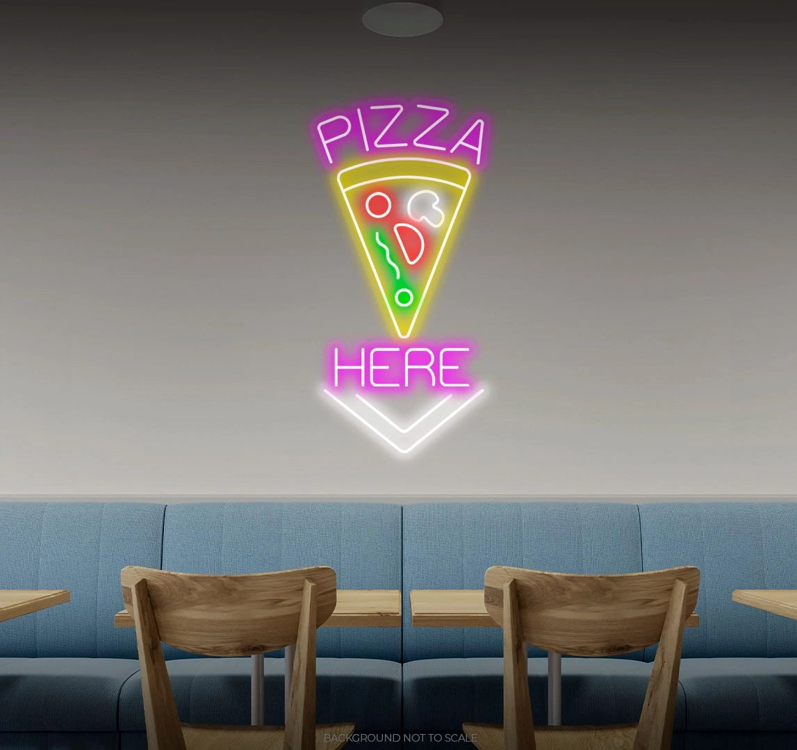 Elevate Your Space with Culinary Vibes: Embrace the delectable and inviting ambiance with our LED neon sign, casting a radiant glow that symbolizes the spirit of culinary delight within the phrase "Pizza Here."
