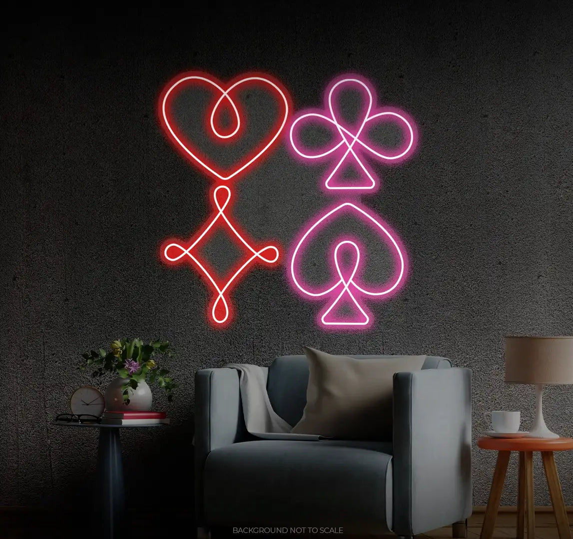 Brighten up your space with the Playing Cards Symbols LED Neon, and let your love for cards shine through! Order today and bring a winning vibe to your room! 🃏♠️♦️♥️♣️