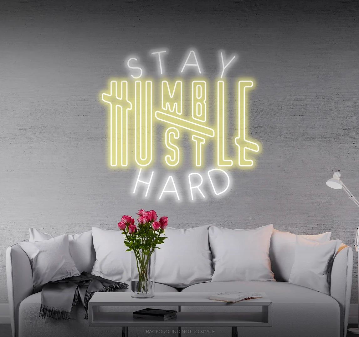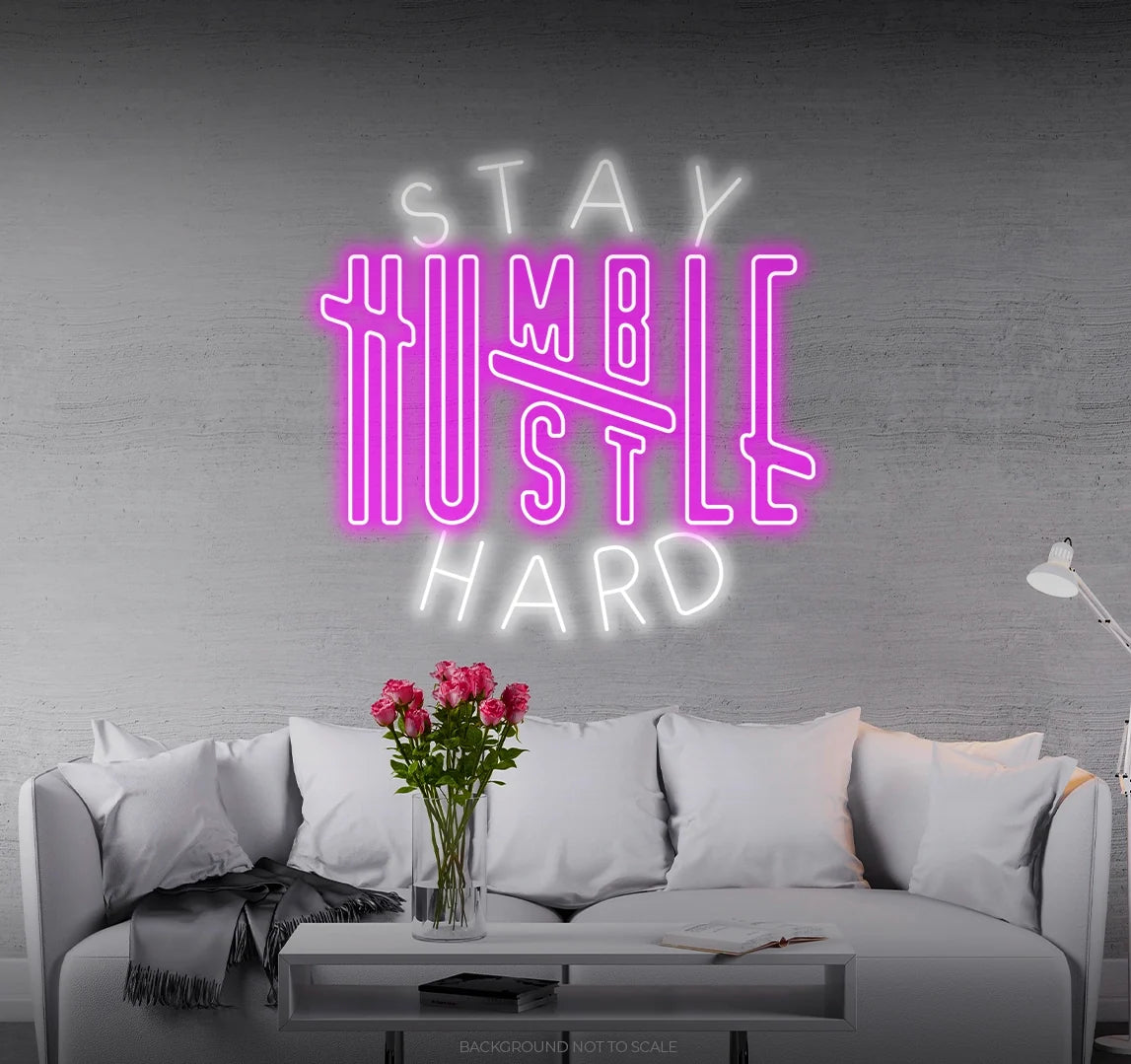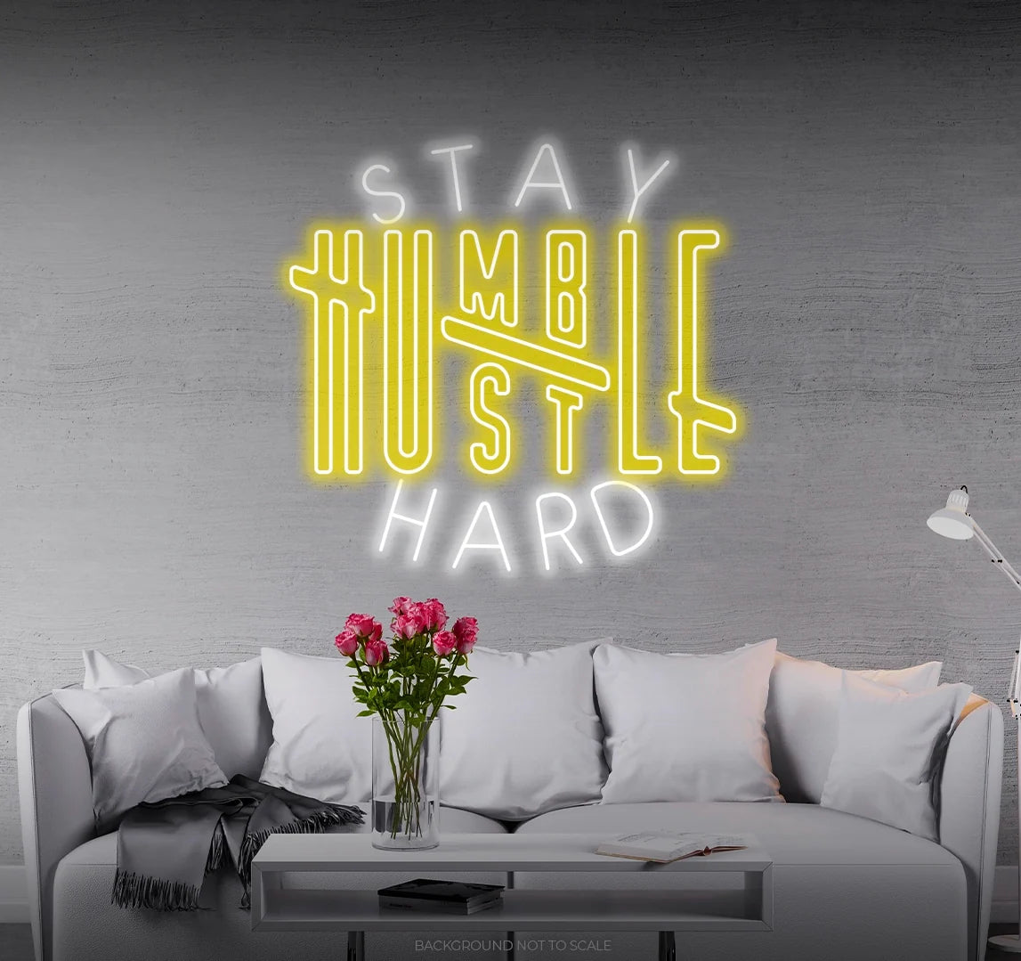 Inspiring Signage Splendor: Illuminate your space with the empowering glow of our LED neon sign. It doesn't just light up; it radiates with the timeless charm of "Stay Humble, Hustle Hard," capturing the essence of dedication and the ambition to achieve.