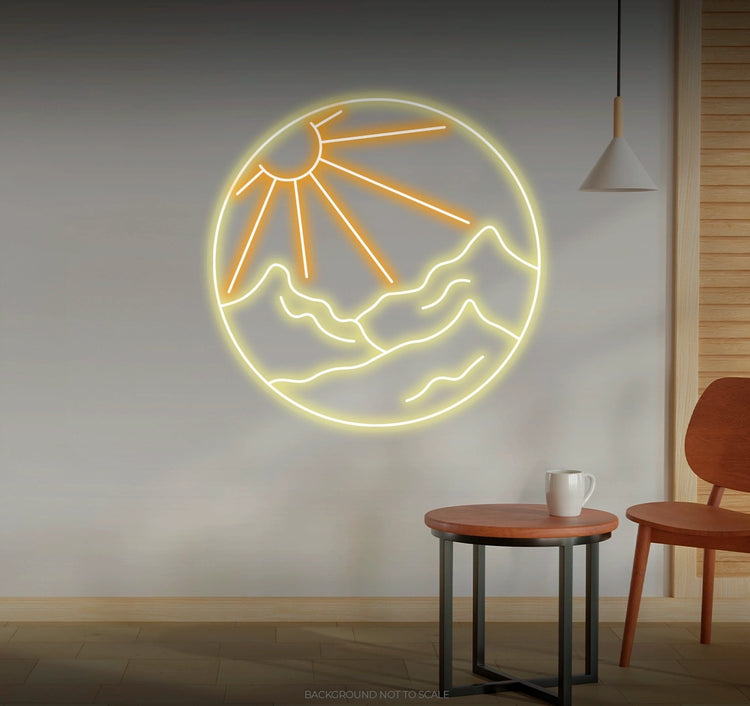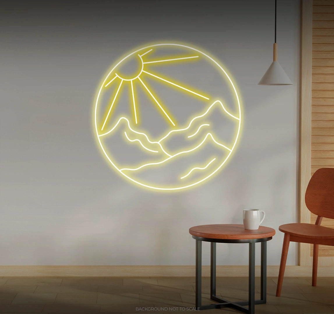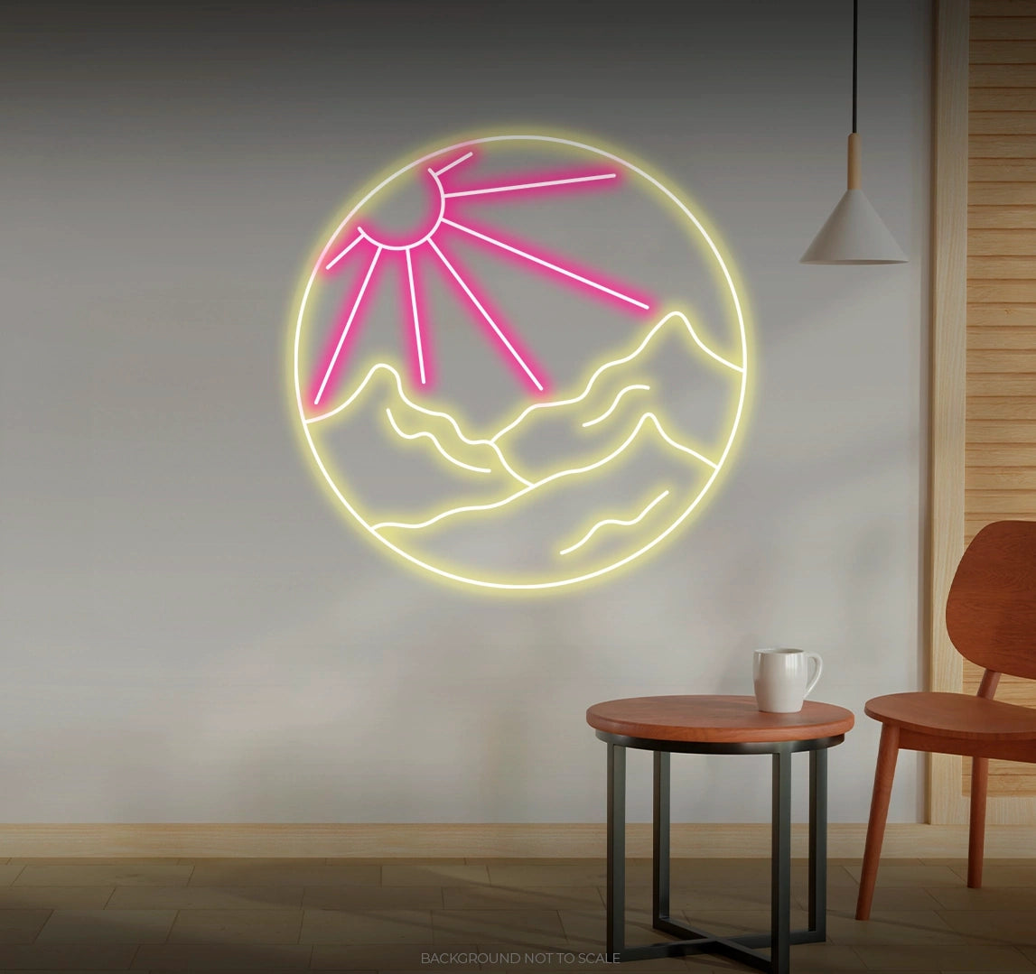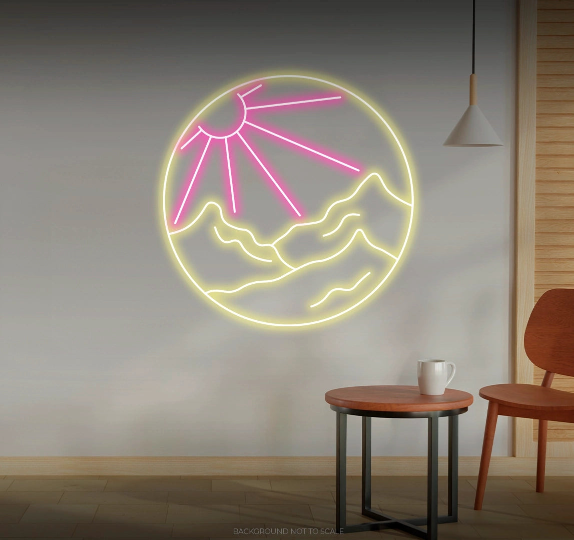 Scenic Signage Splendor: Illuminate your space with the enchanting glow of our LED neon sign. It doesn't just light up; it radiates with the timeless charm of the "Sun and Mountains Circle," capturing the essence of serene landscapes and the majesty of the natural world.