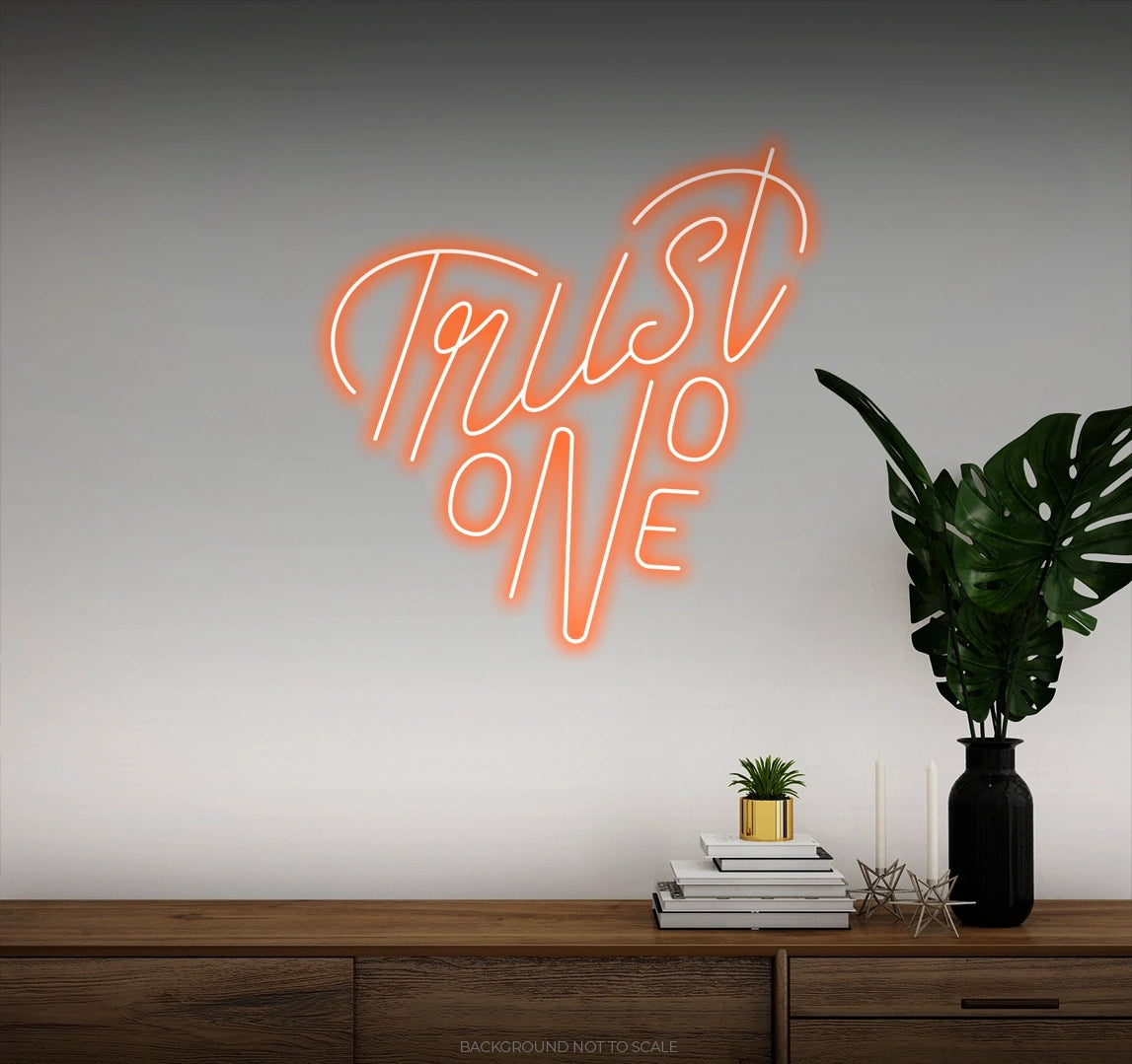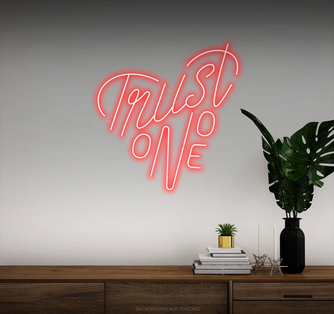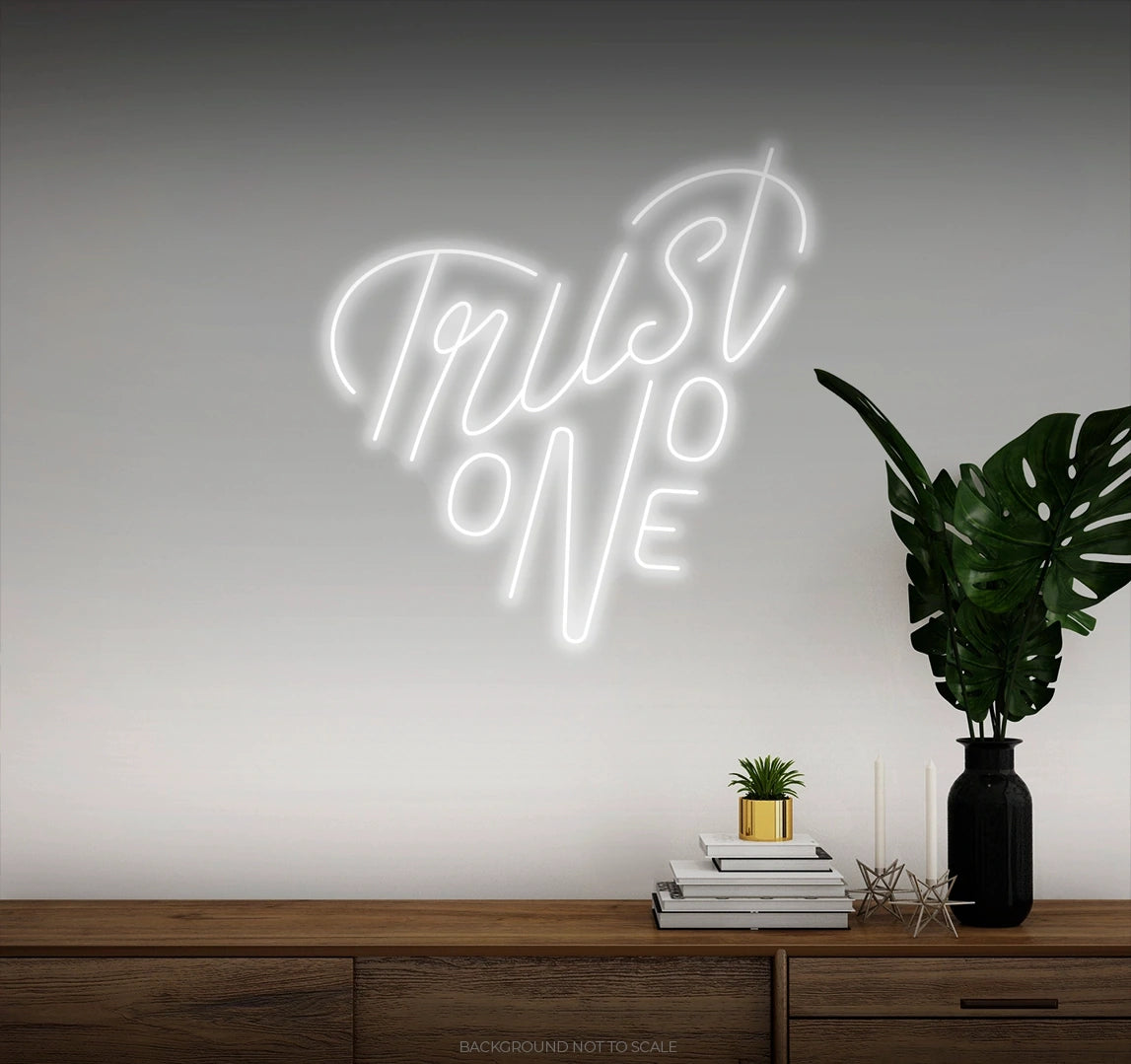 Cautionary Signage Splendor: Illuminate your space with the intriguing glow of our LED neon sign. It doesn't just light up; it radiates with the timeless charm of "Trust No One," capturing the essence of careful consideration and the discerning heart within a heart-shaped design.