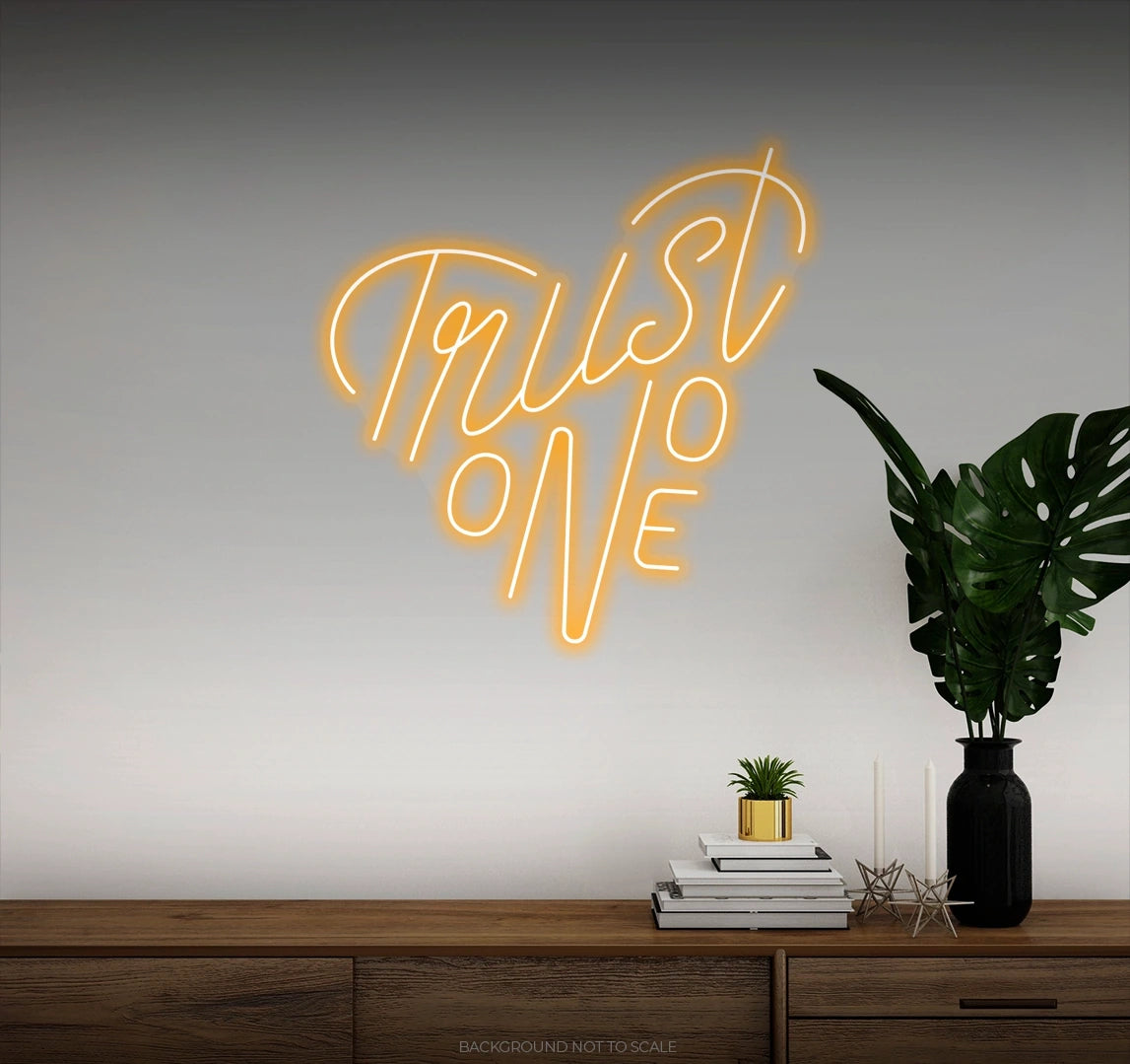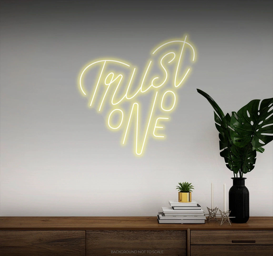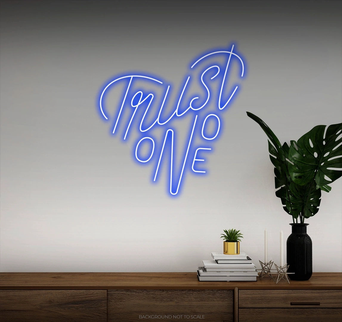 Cautionary Signage Splendor: Illuminate your space with the intriguing glow of our LED neon sign. It doesn't just light up; it radiates with the timeless charm of "Trust No One," capturing the essence of careful consideration and the discerning heart within a heart-shaped design.