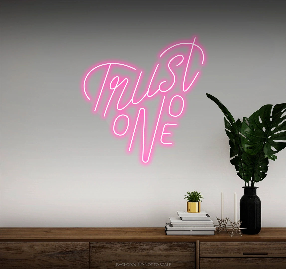 Discerning Elegance: Immerse your space in the intriguing glow as our LED neon sign spells out the cautionary message "Trust No One" within a heart shape. It embodies a sense of discernment and self-protection, urging you to navigate life with a careful heart.