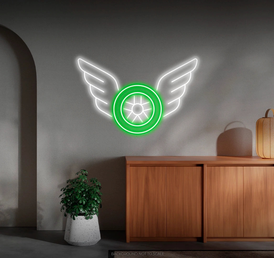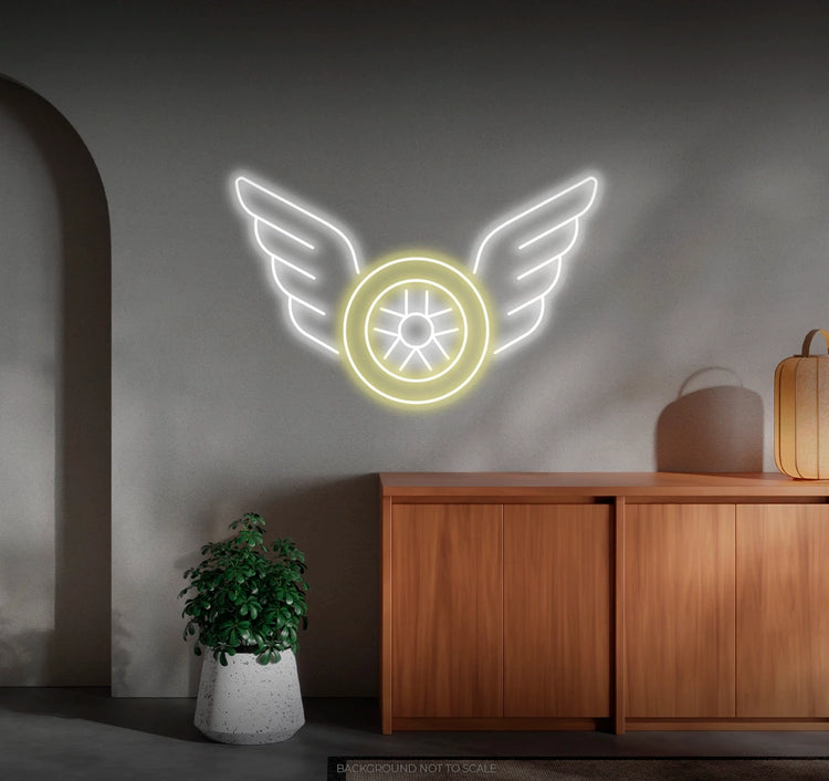 Spirited Design: Illuminate your space with the bold glow of our "Wheel with Wings" LED Neon. Beyond its luminosity, it showcases the iconic silhouette of a wheel with wings, symbolizing the freedom and exhilaration of the open road.